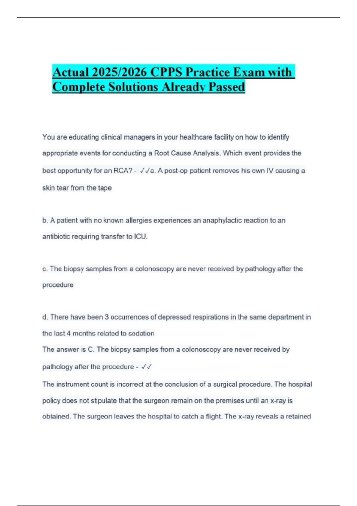 Actual 2025/2026 CPPS Practice Exam with Complete Solutions Already Passed You are educating clinical managers in your healthcare facility on how to identify appropriate events for conducting a Root Cause Analysis. Which event provides the best opportunity for an RCA? - a. A post-op patient removes his own IV causing a skin tear from the tape b. A patient with no known allergies experiences an anaphylactic reaction to an antibiotic requiring transfer to ICU. c. The biopsy samples from a colonoscopy are never received by pathology after the procedure d. There have been 3 occurrences of depressed respirations in the same department in the last 4 months related to sedation The answer is C. The biopsy samples from a colonoscopy are never received by pathology after the procedure -