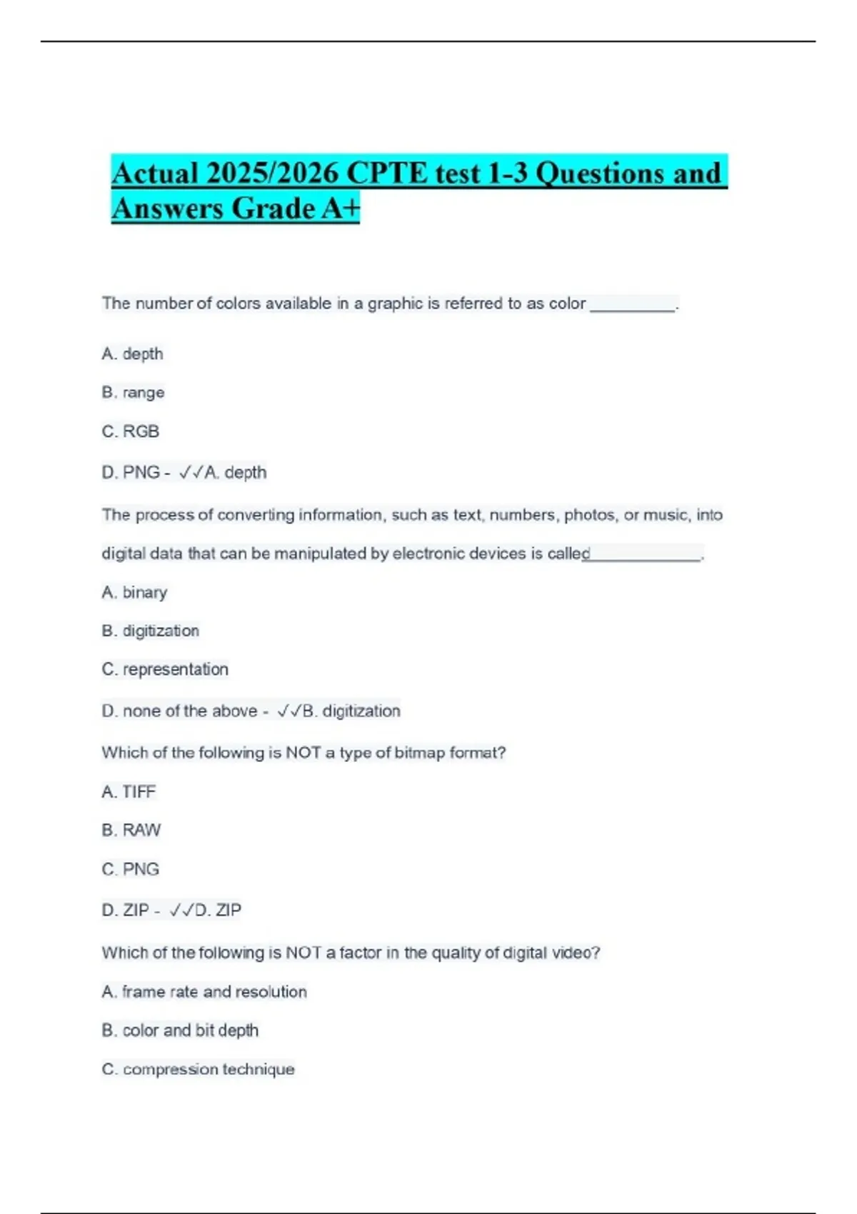 Actual 2025/2026 CPTE test 1-3 Questions and Answers Grade A+ The number of colors available in a graphic is referred to as color . Actual 2025/2026 CPTE test 1-3 Questions and Answers Grade A+ A. depth B. range C. RGB D. PNG - A. depth The process of converting information, such as text, numbers, photos, or music, into digital data that can be manipulated by electronic devices is called . A. binary B. digitization C. representation D. none of the above - B. digitization Which of the following is NOT a type of bitmap format? A. TIFF B. RAW C. PNG D. ZIP - D. ZIP Which of the following is NOT a factor in the quality of digital video? A. frame rate and resolution B. color and bit depth C. compression technique