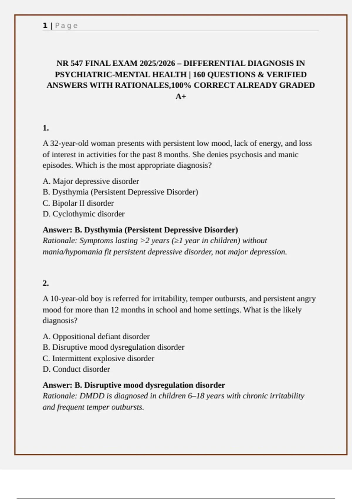 Get ready for the NR 547 Final Exam with this updated 2025/2026 study guide. It includes 160 verified differential diagnosis questions and answers with rationales covering psychiatric-mental health disorders across the lifespan. Designed for PMHNP students, this exam prep resource covers mood disorders, anxiety, psychotic disorders, neurocognitive disorders, childhood conditions, and personality disorders. Each question comes with answer choices (A–D), correct responses, and explanations to help you master key clinical concepts. Perfect for nursing students and practitioners aiming for Grade A+ performance on the NR 547 practicum. Study smarter with 100% accurate, up-to-date content.