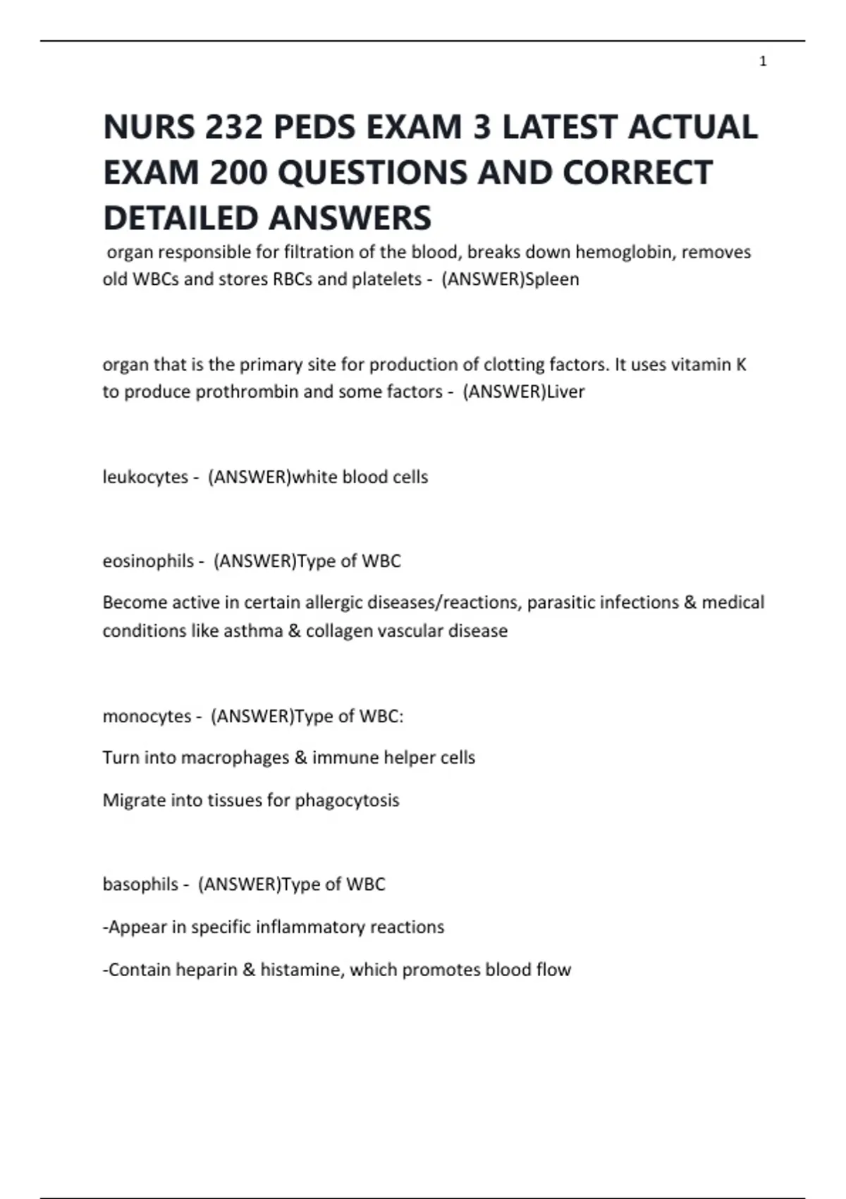 NURS 232 PEDS EXAM 3 LATEST ACTUAL