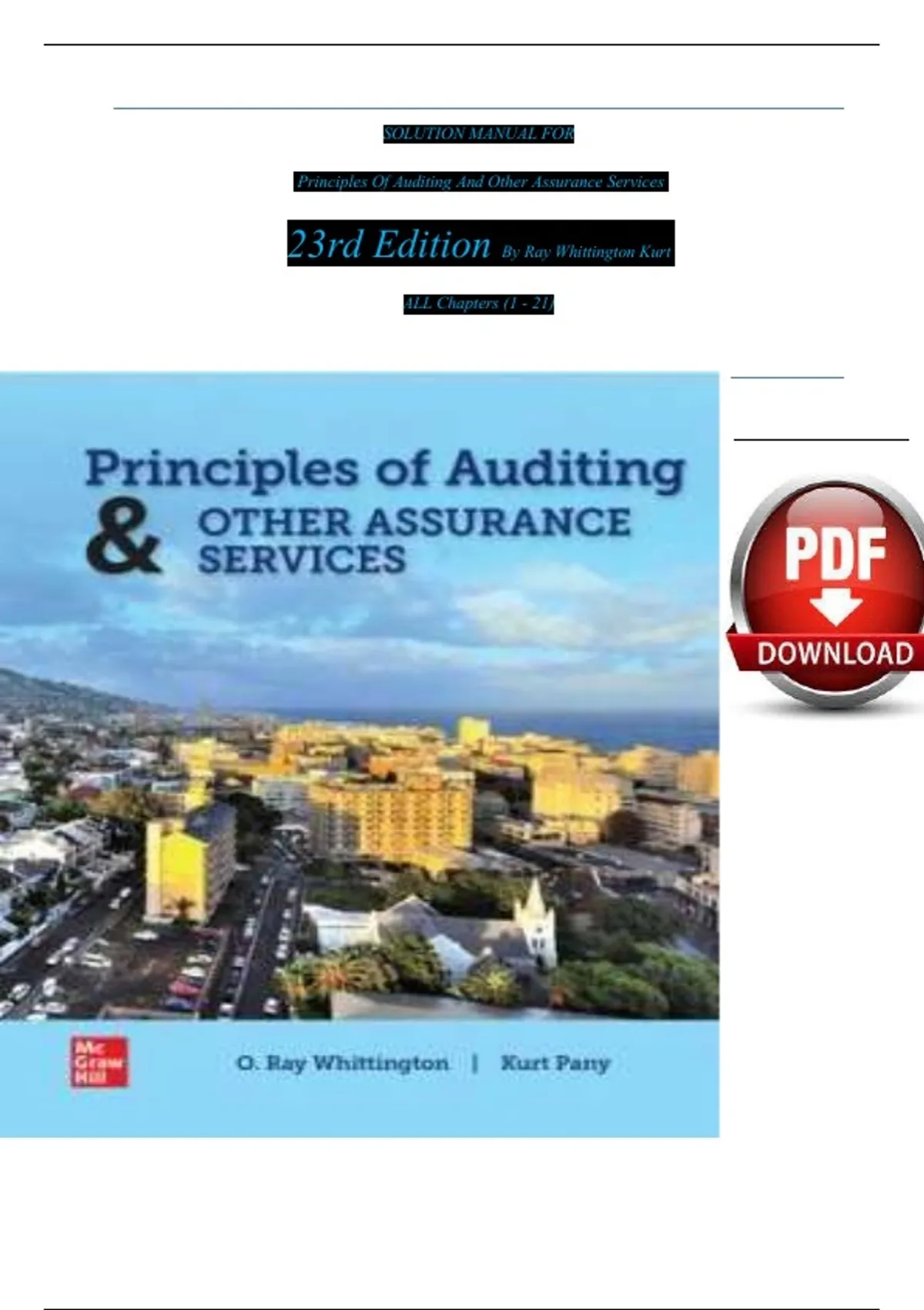 This document provides the full solution manual for Principles of Auditing and Other Assurance Services, 23rd Edition. Covering all chapters 1 through 21, it includes step-by-step solutions to exercises, problems, and review questions from the textbook. A comprehensive study aid designed for students preparing for exams, quizzes, and assignments in auditing and assurance courses, helping to strengthen understanding of key auditing principles and applications.