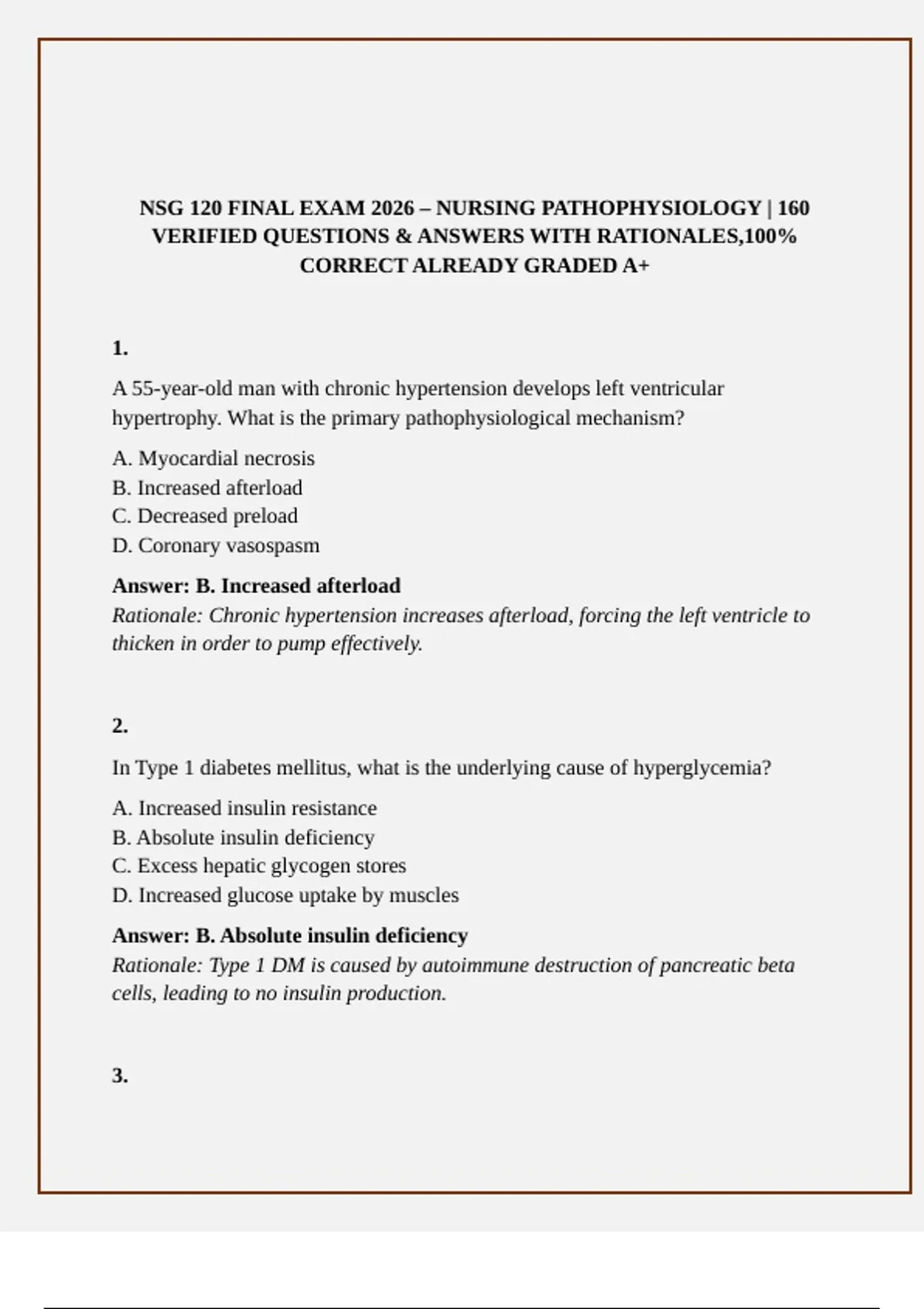 Ace your NSG 120 Nursing Pathophysiology Final Exam with this updated 2026 exam review guide. Covering all units, this resource provides 160 verified questions and answers with detailed rationales to help you understand key concepts. Topics include cardiovascular, respiratory, renal, endocrine, hematologic, musculoskeletal, and neurologic disorders, with emphasis on disease mechanisms and clinical manifestations. Each question includes multiple-choice options, correct answers, and explanations for effective learning. Designed for nursing students aiming for Grade A performance, this exam prep ensures 100% accuracy and clarity. Master pathophysiology and prepare with confidence using this comprehensive NSG 120 review