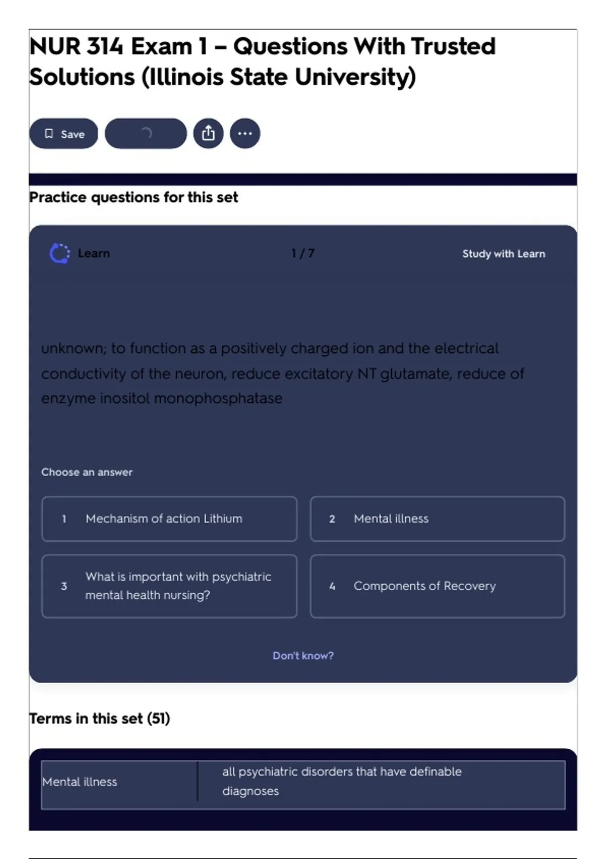 NUR 314 Exam 1 – Questions With Trusted Solutions (Illinois State University)
