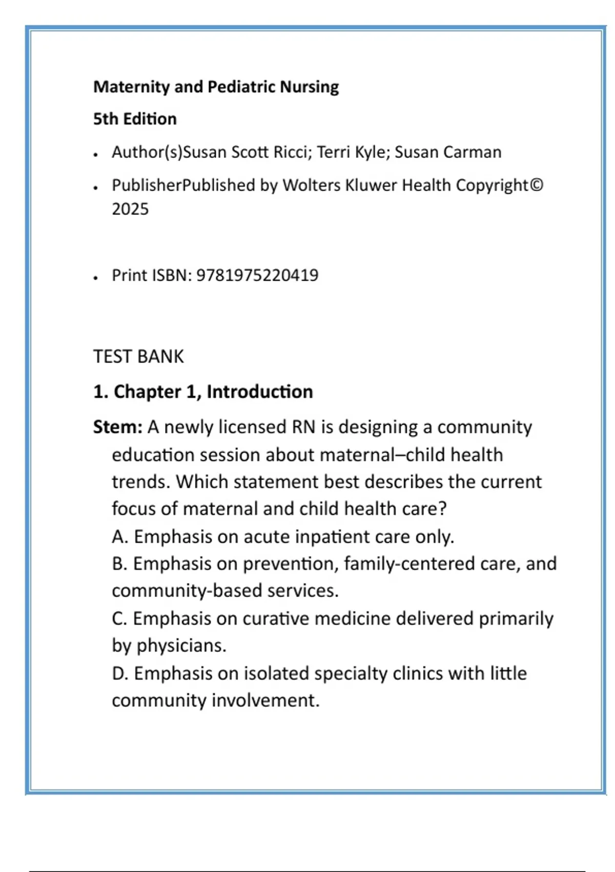 Maternity and Pediatric Nursing 5th Ed Test Bank — Verified Answers & Rationales Variation B: Test Bank: Maternity and Pediatric Nursing (5th Edition) — Verified Answers & Rationales Description: Master maternal–child concepts and pass your certification with confidence. This complete, chapter-by-chapter test bank for Maternity and Pediatric Nursing, 5th Edition (Ricci, Kyle, Carman) delivers clinical-strength practice designed for undergraduate students and certification candidates. Every chapter is fully covered with 20 high-quality MCQs, correct answers, and step-by-step verified rationales that explain not only what is correct but why — perfect for deep learning and clinical application. Questions emphasize scenario-based decision-making, legal/ethical issues, maternal–fetal care, newborn assessment, pediatric growth and development, and population health — aligned with NCLEX-style formats and common certification blueprints. Use it to create timed quizzes, group study sessions, or targeted review plans on Stuvia, Etsy, Amazon KDP, and Teachers Pay Teachers. Clear formatting, educator-focused rationales, and evidence-based explanations make this resource ideal for rapid review, remediation, and curriculum mapping. Backed by meticulous cross-referencing to each chapter, this test bank is your streamlined study system for exam readiness and real-world clinical competence. Study smarter—guaranteed support for focused practice, improved retention, and confidence at exam time. Keywords: Ricci Kyle Carman 5e nursing maternity pediatric practice questions NCLEX maternal-child review chapter-based MCQ bank 20-per-chapter certification exam prep pediatric maternity step-by-step rationale nursing questions clinical maternal-newborn question set evidence-based obstetric pediatric review Hashtags: #MaternityNurseTips #PedsStudyPack #NCLEXMastery #NursingExamReady #ClinicalNursingQA #NewbornNursing #StudySmartNursing #RicciKyleAuthors #ChapterWiseMCQs #ExamRationaleGuide