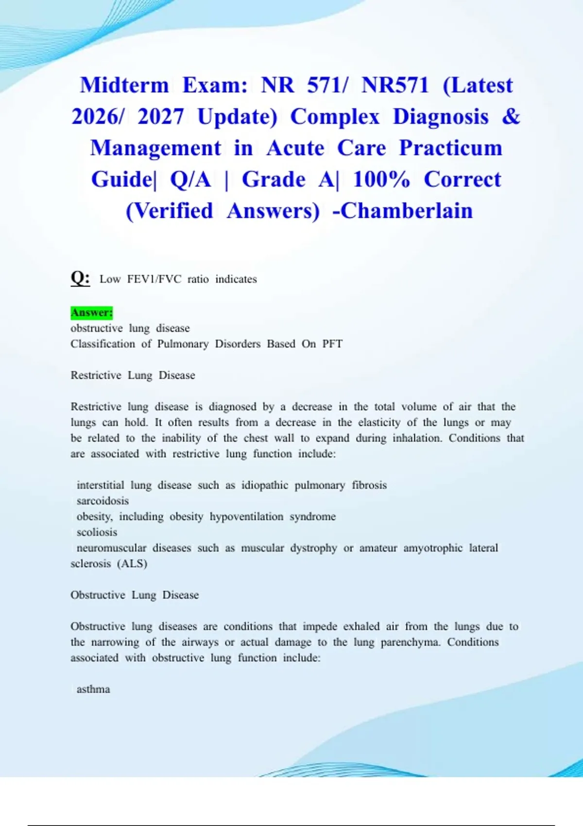 Midterm Exam: NR 571/ NR571 (Latest 2026/ 2027 Update) Complex Diagnosis & Management in Acute Care Practicum Guide| Q/A | Grade A| 100% Correct (Verified Answers) -Chamberlain QUESTION Low FEV1/FVC ratio indicates Answer: obstructive lung disease Classification of Pulmonary Disorders Based On PFT Restrictive Lung Disease Restrictive lung disease is diagnosed by a decrease in the total volume of air that the lungs can hold. It often results from a decrease in the elasticity of the lungs or may be related to the inability of the chest wall to expand during inhalation. Conditions that are associated with restrictive lung function include: interstitial lung disease such as idiopathic pulmonary fibrosis sarcoidosis obesity, including obesity hypoventilation syndrome scoliosis neuromuscular diseases such as muscular dystrophy or amateur amyotrophic lateral sclerosis (ALS) Obstructive Lung Disease Obstructive lung diseases are conditions that impede exhaled air from the lungs due to the narrowing of the airways or actual damage to the lung parenchyma. Conditions associated with obstructive lung function include: asthma chronic obstructive pulmonary disease (COPD) cystic fibrosis bronchiectasis Diagnostic Approach The provider's ability to accurately interpret PFTs does improve with experience but is best performed when a systematic approach is used. A systematic approach is helpful to accurately interpret PFTs and includes the following steps: Determine if the FEV1/FVC ratio is low. This finding will indicate that there is an obstructive defect present. Determine if the FVC is low. This finding will indicate a restrictive pattern indicating restrictive lung disease, a mixed pattern, or pure obstructive lung disease with air trapping. Grade the severity of the abnormality. If there is an obstructive defect, restrictive pattern, or mix pattern, you should grade the severity of the abnormality based on the FEV1 percentage predicted based on the American Thoracic Society's (ATS) system for QUESTION Low FEV1/FVC ratio indicates Answer: obstructive lung disease QUESTION Low FVC indicates Answer: restrictive pulmonary disease, a mixed pattern, or pure obstructive lung disease with air trapping QUESTION American thoracic society's (ATS) system for grading PFT abnormalities Answer: If there is an obstructive defect, restrictive pattern, or mixed pattern, you should grade the severity of the abnormality based on the FEV1 % predicted based on ATS's system QUESTION Determine the reversibility of obstructive defect by Answer: The increase in FEV1 or FVC after bronchodilator treatment. If FEV or FEV1 increases by 12%, obstructive pattern is reversible. QUESTION PFTs pre-procedure Answer: If the patient has underlying chronic respiratory disorders, such as COPD or moderate to severe asthma Purpose to evaluate the need additional respiratory support or design treatment plan for patient who may need mechanical ventilation. QUESTION Obstructive PFTs Answer: Characterized by low FEV1/FVC ratio. 70% QUESTION Restrictive PFTs Answer: Reduced FEV1 and FVC with preserved FEV1/FVC ratio QUESTION Bronchoprovocation testing Answer: Used when exercise or allergen induced asthma may be causing the abnormality. If FEV1 70% predicted on Spirometry, this test uses methacholine or mannitol inhalation challenge to confirm. QUESTION GOLD grading system Answer: Used to assess severity of COPD (the disease not the exacerbation) Global-initiative Obstructive Lung Disease (GOLD) Based on symptoms, number of exacerbations, COPD-related hospitalizations, and Spirometry results QUESTION COPD diagnosis Answer: FEV1/FVC ratio 0.7 or 70% on Spirometry QUESTION COPD treatment Answer: Long acting B2 agonist (LABA), long, acting, antimuscarinic agent (LAMA), inhaled corticosteroids (ICS), systemic corticosteroids, antibiotics when signs of bacterial infection exist. Short acting beta agonists (SABA) with or without short acting anticholinergics. QUESTION Mild to moderate asthma