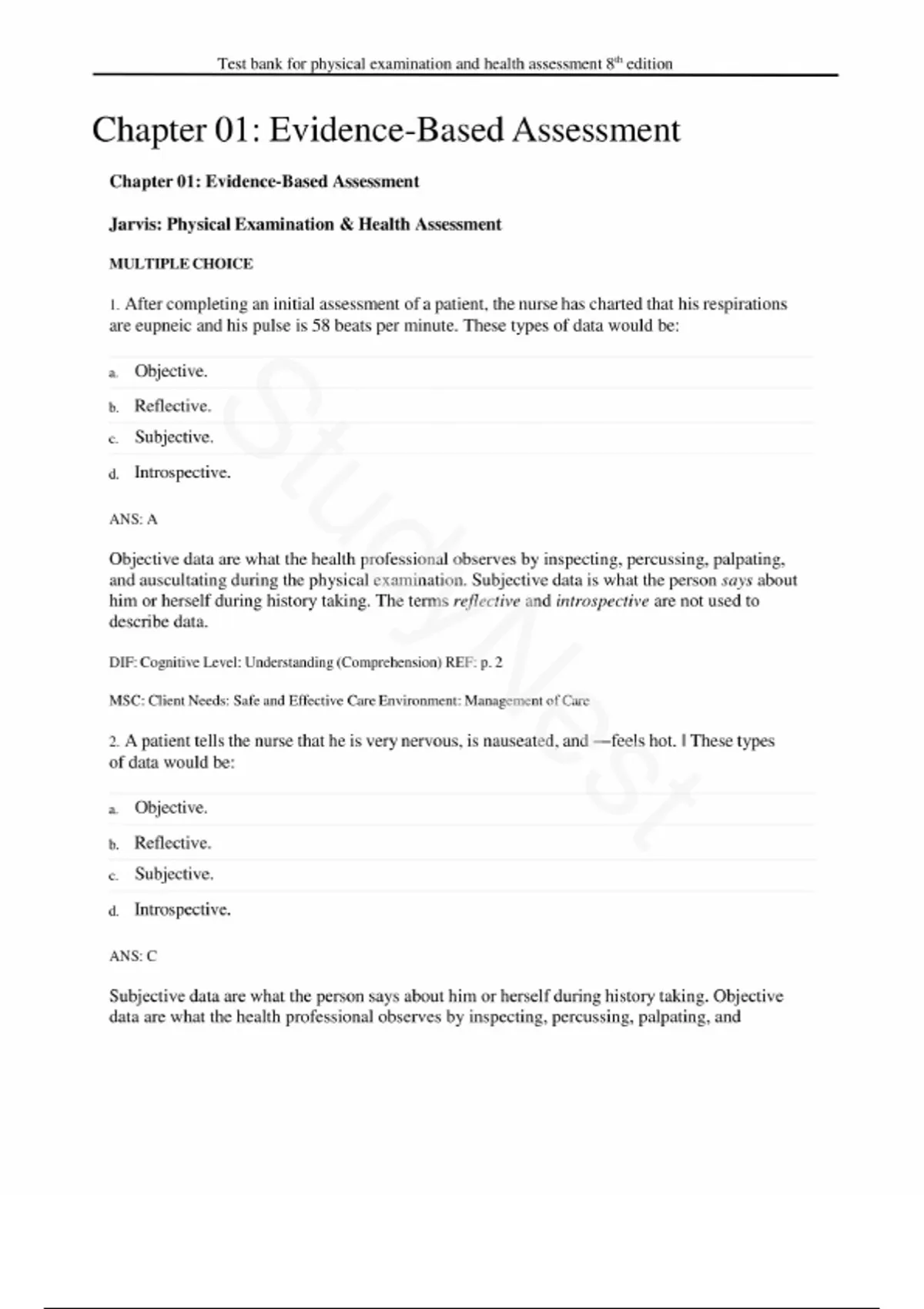 test bank for Jarvis's Physical Examination and Health Assessment 8th edition by carolyn jarvis complete guide Table of Contents Chapter 01: Evidence-Based Assessment Chapter 02: Cultural Assessment Chapter 03: The Interview Chapter 04: The Complete Health History Chapter 05: Mental Status Assessment Chapter 06: Substance Use Assessment Chapter 07: Domestic and Family Violence Assessment Chapter 08: Assessment Techniques and Safety in the Clinical Setting Chapter 09: General Survey and Measurement Chapter 10: Vital Signs Chapter 11: Pain Assessment Chapter 12: Nutrition Assessment Chapter 13: Skin, Hair, and Nails Chapter 14: Head, Face, Neck, and Regional Lymphatics Chapter 15: Eyes Chapter 16: Ears Chapter 17: Nose, Mouth, and Throat Chapter 18: Breasts, Axillae, and Regional Lymphatics Chapter 19: Thorax and Lungs Chapter 20: Heart and Neck Vessels Chapter 21: Peripheral Vascular System and Lymphatic System Chapter 22: Abdomen Chapter 23: Musculoskeletal System Chapter 24: Neurologic System Chapter 25: Male Genitourinary System Chapter 26: Anus, Rectum, and Prostate Chapter 27: Female Genitourinary System Chapter 28: The Complete Health Assessment: Adult Chapter 29: The Complete Physical Assessment: Infant, Child, and Adolescent Chapter 30: Bedside Assessment and Electronic Documentation Chapter 31: The Pregnant Woman Chapter 32: Functional Assessment of the Older Adult