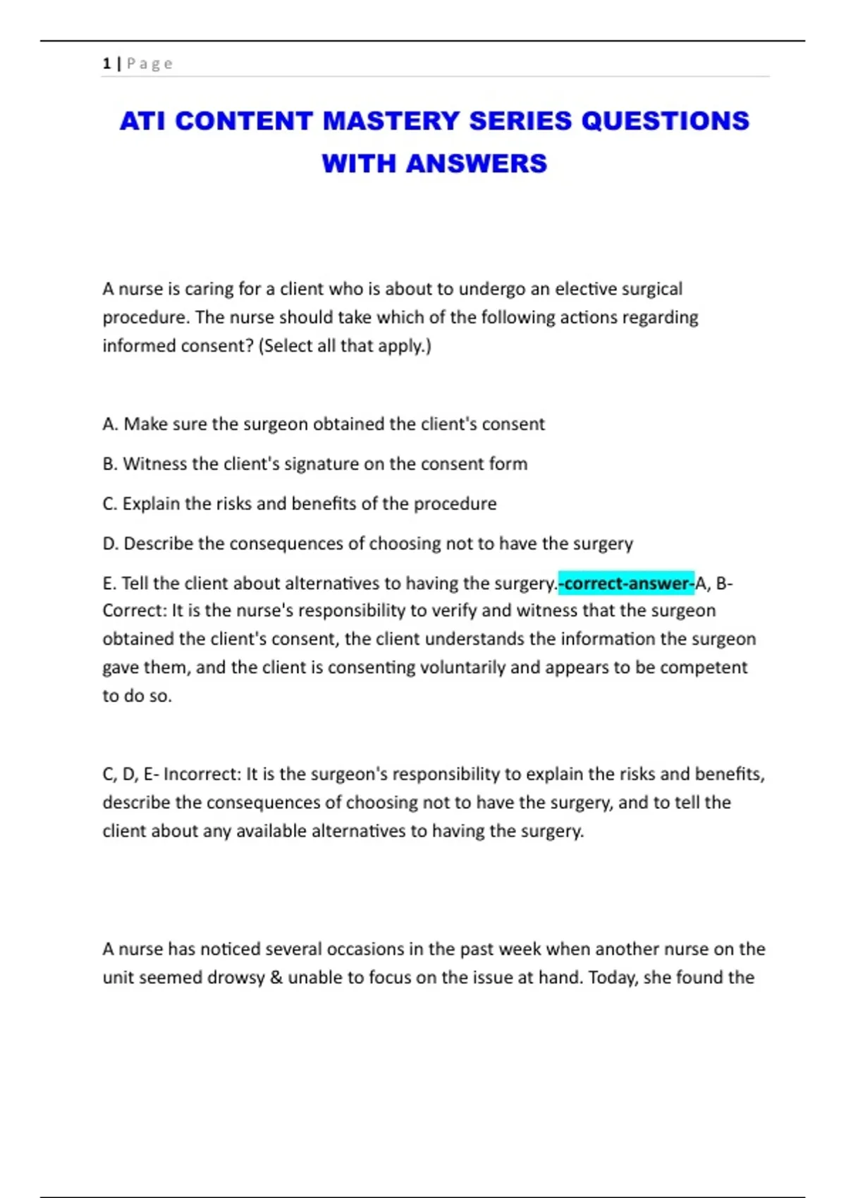 ATI CONTENT MASTERY SERIES QUESTIONS