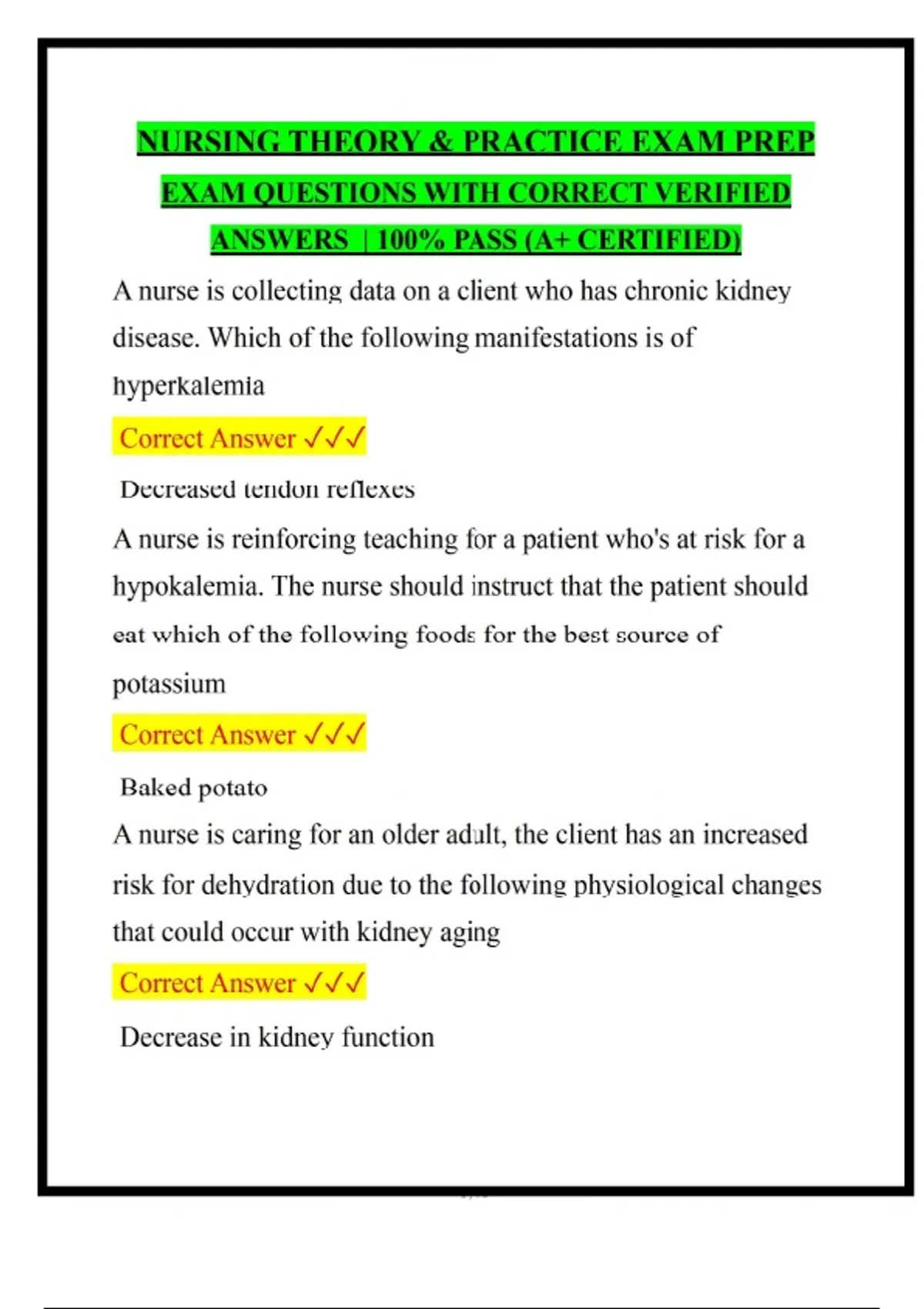 NURSING THEORY & PRACTICE EXAM PREP EXAM QUESTIONS WITH CORRECT VERIFIED ANSWERS | 100% PASS (A+ CERTIFIED) A nurse is collecting data on a client who has chronic kidney disease. Which of the following manifestations is of hyperkalemia Correct Answer Decreased tendon reflexes A nurse is reinforcing teaching for a patient who's at risk for a hypokalemia. The nurse should instruct that the patient should eat which of the following foods for the best source of potassium Correct Answer Baked potato A nurse is caring for an older adult, the client has an increased risk for dehydration due to the following physiological changes that could occur with kidney aging Correct Answer Decrease in kidney function 2 / 76 A nurse is caring for a client who has nausea and vomiting. The nurse should identify the client as at risk for which of the following acid-base imbalances Correct Answer Metabolic Alkalosis A nurse is assessing a client who has respiratory alkalosis. Which of the following findings should the nurse expect Correct Answer Hyperventilation A nurse is caring for a client who has COPD. The nurse should identify the client is at risk for of the following acid-base imbalances Correct Answer Respiratory Acidosis A nurse is assisting in the care of a client who has diabetic ketoacidosis and hypoxia. Which of the following actions should the nurse take first Correct Answer Obtain the prescription for supplemental oxygen The client is at risk for developing metabolic alkalosis due to 3 / 76 Correct Answer Nasogastric suctioning A nurse is collecting data on a client who has diarrhea. Which of the following findings is a manifestation of hypokalemia Correct Answer Muscle weakness Which of the following interventions are appropriate for treating hyponatremia Correct Answer Implement fall precautions Hold diuretics Administer 3% normal saline intravenously and measure intake/output Which of the following is a symptom of hypocalcemia Correct Answer Tetany Which of the following is a common manifestation of hypokalemic shock Correct Answer Tachycardia 4 / 76 What puts older adults at risk for polypharmacy Correct Answer Having multiple comorbidities Select the unexpected findings of a cardiovascular assessment Correct Answer Bilateral pitting edema in the l