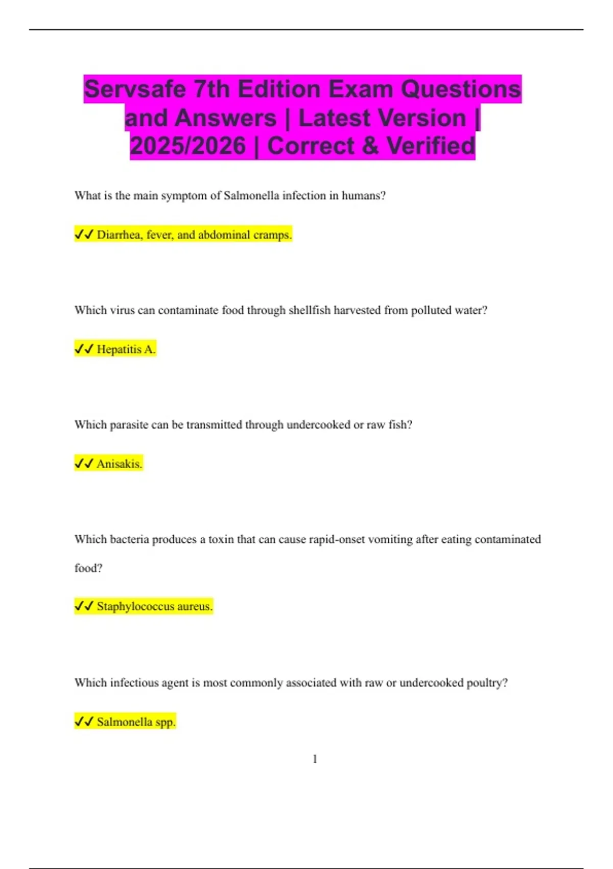 Servsafe 7th Edition Exam Questions and Answers | Latest Version | 2025/2026 | Correct & Verified What is the main symptom of Salmonella infection in humans? Diarrhea, fever, and abdominal cramps. Which virus can contaminate food through shellfish harvested from polluted water? Hepatitis A. Which parasite can be transmitted through undercooked or raw fish? Anisakis. Which bacteria produces a toxin that can cause rapid-onset vomiting after eating contaminated food? Staphylococcus aureus. Which infectious agent is most commonly associated with raw or undercooked poultry? Salmonella spp. 2 Which microorganism can survive freezing but grows when food is thawed improperly? Listeria monocytogenes. Which pathogen can contaminate ready-to-eat foods and grow at refrigeration temperatures? Listeria monocytogenes. Which bacteria is responsible for botulism and produces a deadly neurotoxin? Clostridium botulinum. Which virus is prevented by vaccination but can still cause outbreaks if food handlers are infected? Hepatitis A. Which bacteria is associated with improperly stored or fermented foods producing neurotoxins? Clostridium botulinum. Which pathogen can be spread by cross-contamination from raw meats to ready-to-eat foods? 3 Salmonella spp. Which infectious agent is a concern in unpasteurized fruit juices and cider? Escherichia coli O157:H7. Which bacteria can survive acidic foods but grows in refrigerated ready-to-eat meals? Listeria monocytogenes. Which infectious disease can be transmitted via food prepared by someone with diarrhea or vomiting? Norovirus. Which pathogen is commonly linked to foodborne outbreaks of potato salad or egg salad left at room temperature? Staphylococcus aureus. Which parasite can cause muscle cysts when pork or wild game is undercooked? Trichinella spiralis. 4 Which pathogen is responsible for the majority of viral foodborne illness outbreaks worldwide? Norovirus. Which bacteria can cause severe illness in the elderly and immunocompromised through contaminated ready-to-eat foods? Listeria monocytogenes. Which infectious agent can survive on contaminated cutting boards and kitchen surfaces? Norovirus. Which bacteria can produce toxins in cooked rice left at room temperature for several hours? Bacillus cereus. Which virus is commonly spread in daycares, cruise ships, and restaurants? Norovirus. Which pathogen is most commonly spread by