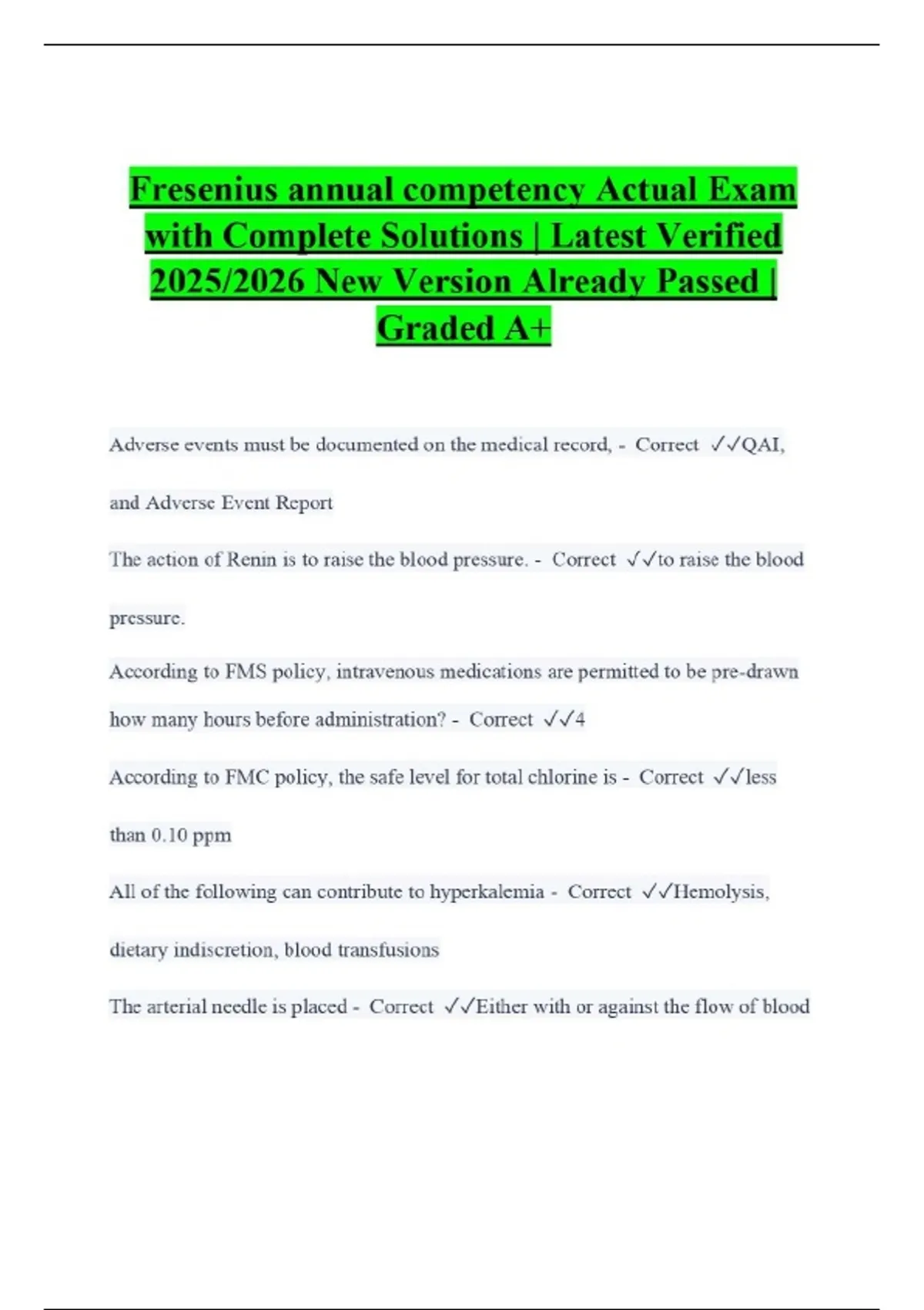 Fresenius annual competency Actual Exam with Complete Solutions | Latest Verified 2025/2026 New Version Already Passed | Graded A+