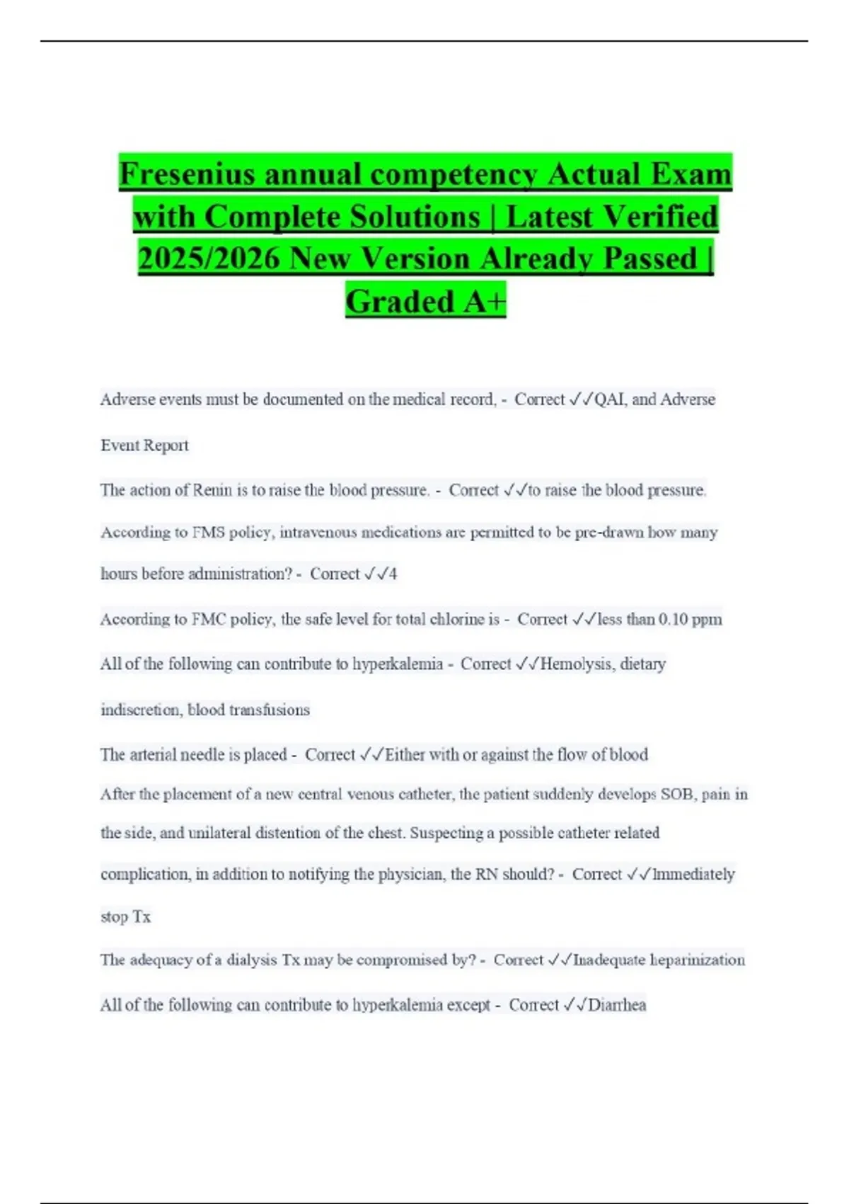 Fresenius annual competency Actual Exam with Complete Solutions | Latest Verified 2025/2026 New Version Already Passed | Graded A+