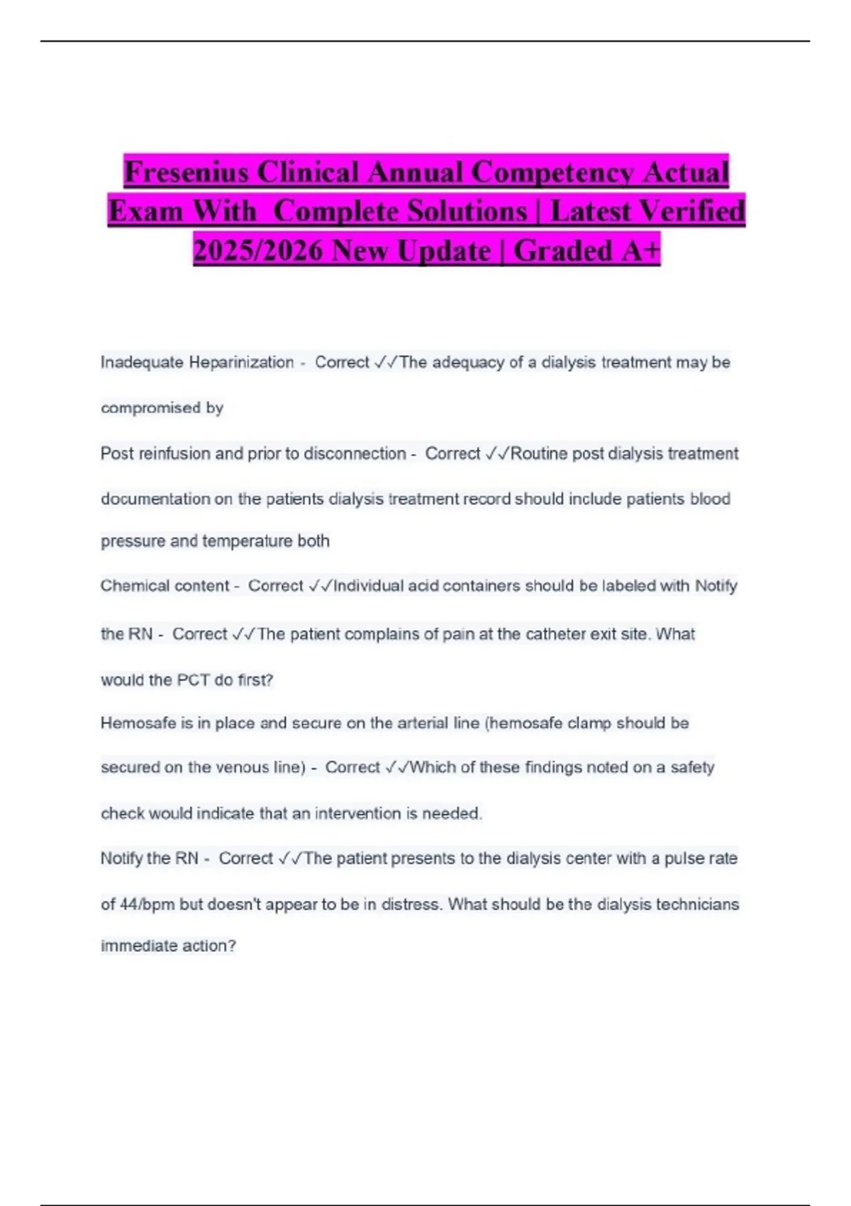 Fresenius Clinical Annual Competency Actual Exam With Complete Solutions | Latest Verified 2025/2026 New Update | Graded A+