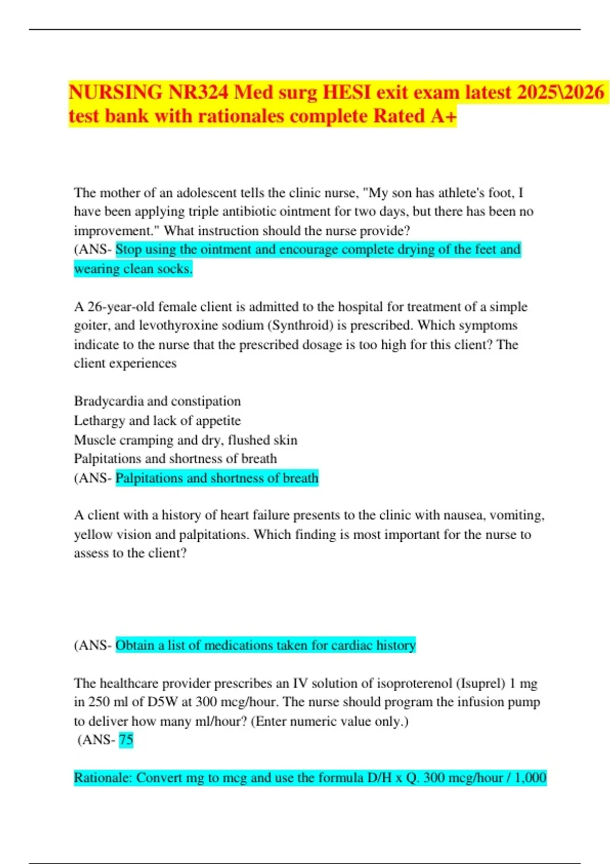 This document provides the complete test bank for the Nursing NR324 Med-Surg HESI Exit Exam, fully updated for 2025/2026. It includes detailed rationales for each question and answer, making it a comprehensive study tool for mastering medical-surgical nursing concepts. Rated A+, this resource ensures effective exam preparation and improved performance.