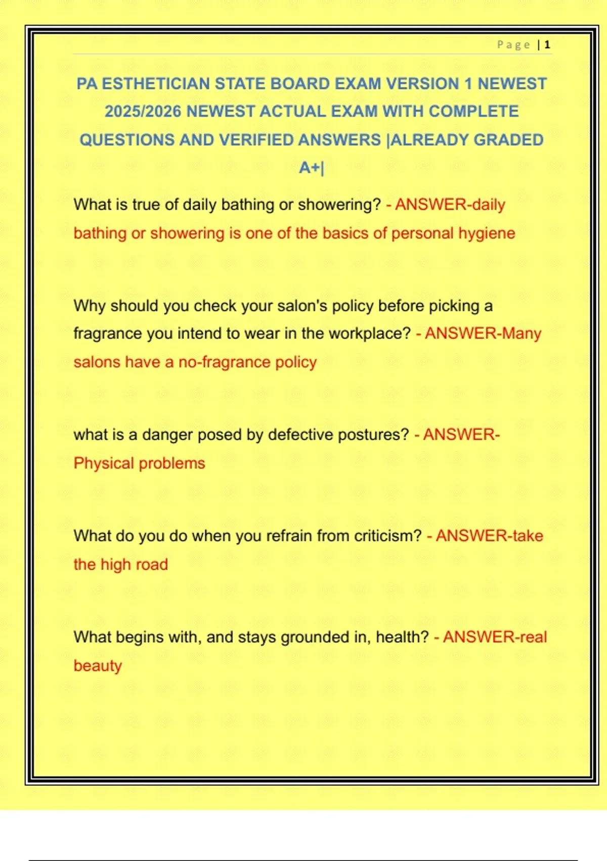 PA ESTHETICIAN STATE BOARD EXAM VERSION 1 NEWEST
