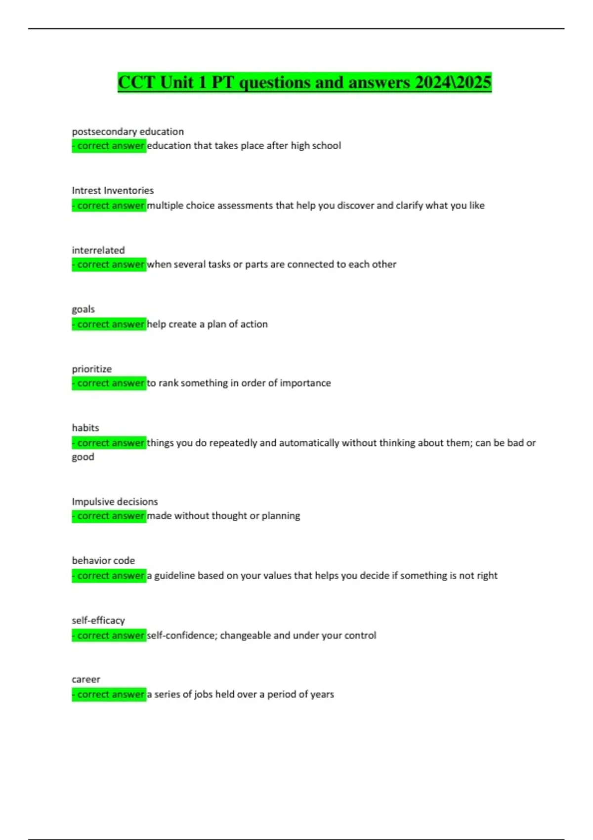 This document provides the full set of CCT Unit 1 PT questions with accurate answers, tailored for the 2024/2025 exam cycle. It focuses on the foundational knowledge required in Unit 1 of the Certified Cost Technician (CCT) program, including cost engineering principles, estimating basics, and project control fundamentals. The material is structured for both practice and revision, making it an essential resource for exam preparation.