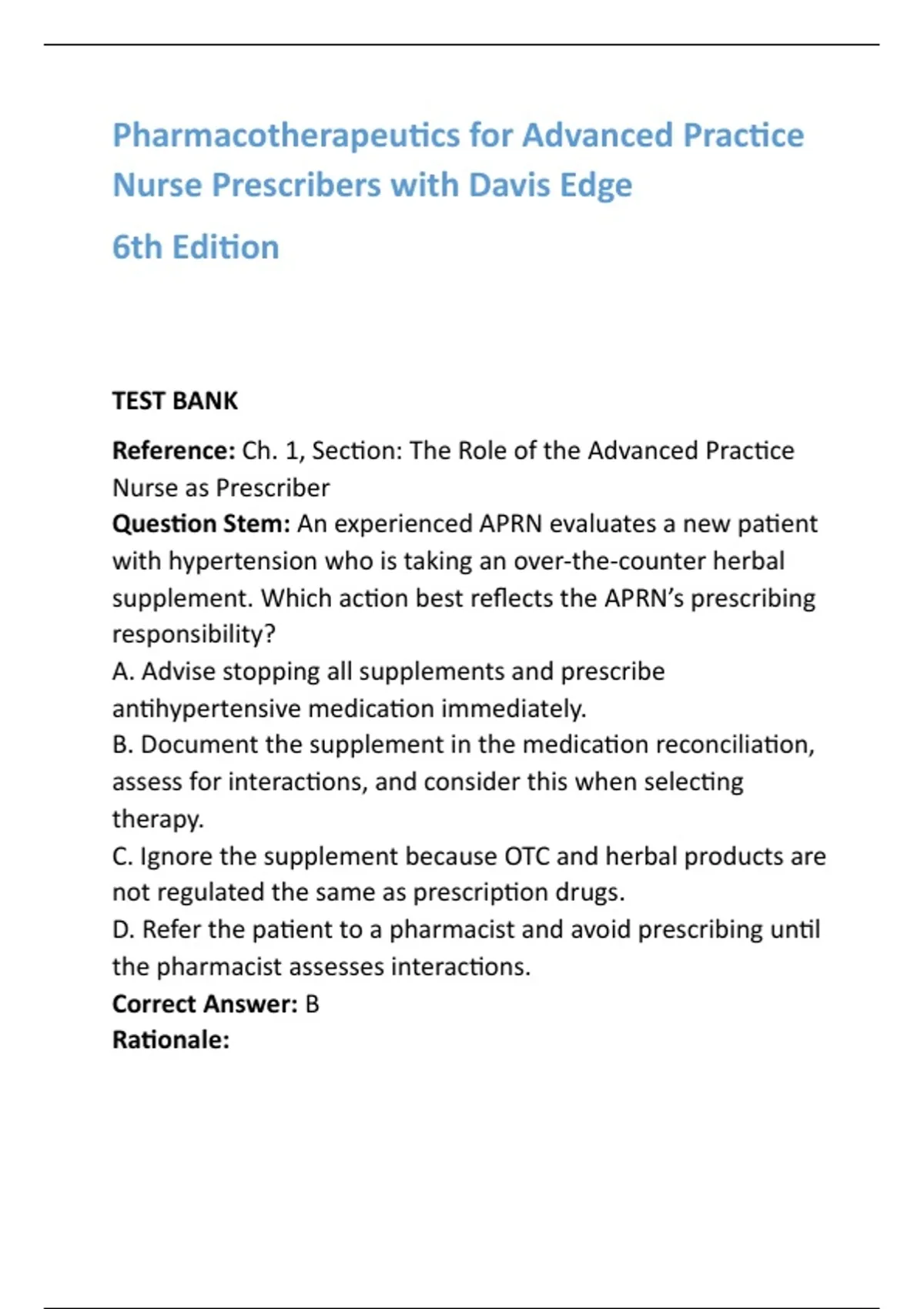 Pharmacotherapeutics for Advanced Practice Nurse Prescribers 6th Edition Test Bank with Answers & Rationales Prepare with confidence using the officially aligned Test Bank for Pharmacotherapeutics for Advanced Practice Nurse Prescribers with Davis Edge, 6th Edition by Teri Moser Woo and Wendy L. Wright. This comprehensive resource is designed specifically for advanced practice nursing students who want to master pharmacotherapeutics and excel in exams. Each chapter is fully covered with 20 multiple-choice questions (MCQs) that reflect real-world prescribing, clinical judgment, and safe medication practices. Every item includes the correct answer plus a step-by-step, verified rationale, so you not only know the right choice but also understand why it is correct. Whether you are preparing for classroom exams, certification, or high-stakes tests like the NCLEX or advanced practice boards, this test bank gives you the edge you need. Content is carefully aligned with current standards and emphasizes critical thinking, rational prescribing, and patient safety—skills every nurse prescriber must demonstrate. Easy to use and student-friendly, this test bank helps you study smarter, strengthen weak areas, and build the confidence to succeed. Perfect for independent learners, nursing faculty, and anyone aiming for guaranteed exam success. Unlock your competitive advantage with the Pharmacotherapeutics for Advanced Practice Nurse Prescribers Test Bank, 6th Edition—your trusted companion for mastering pharmacology at the advanced practice level. Pharmacotherapeutics for Advanced Practice Nurse Prescribers 6th Edition test bank Woo Wright pharmacotherapeutics test bank Pharmacotherapeutics Davis Edge questions Nursing pharmacology test bank with answers NCLEX pharmacology review APRN prescribing exam prep Advanced practice nursing study guide Pharmacology multiple choice questions with rationales Nursing certification exam practice Test bank for nurse prescribers #NursingStudents #NCLEXPrep #NursePractitionerLife #PharmacologyMadeEasy #NursingExamSuccess #StudyNursing #FutureNursePractitioner #NursingSchoolHelp #ExamPrepTools #HealthcareEducation
