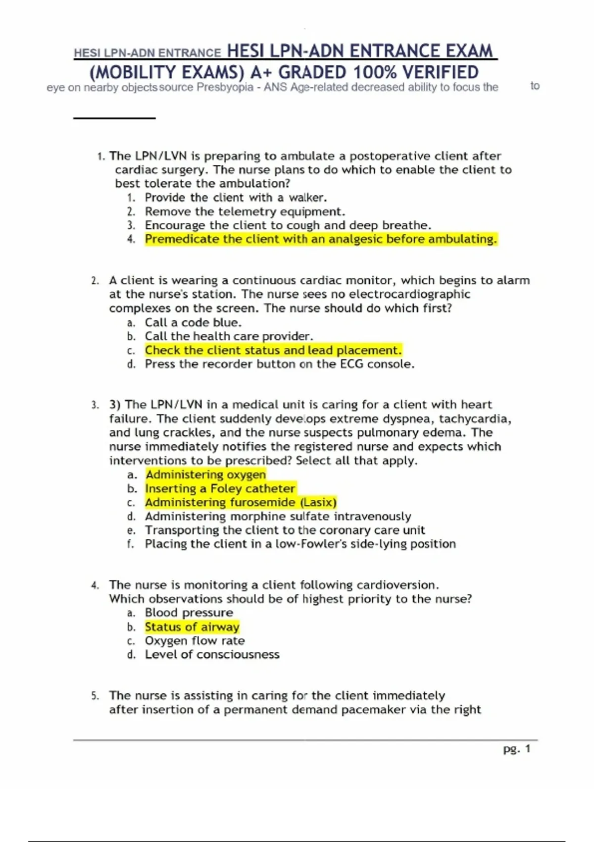 1. The LPN/LVN is preparing to ambulate a postoperative client after cardiac surgery. The nurse plans to do which to enable the client to best tolerate the ambulation? 1. Provide the client with a walker. 2. Remove the telemetry equipment. 3. Encourage the client to cough and deep breathe. 4. Premedicate the client with an analgesic before ambulating. 2. A client is wearing a continuous cardiac monitor, which begins to alarm at the nurse's station. The nurse sees no electrocardiographic complexes on the screen. The nurse should do which first? a. Call a code blue. b. Call the health care provider. c. Check the client status and lead placement. d. Press the recorder button on the ECG console. 3. 3) The LPN/LVN in a medical unit is caring for a client with heart failure. The client suddenly develops extreme dyspnea, tachycardia, and lung crackles, and the nurse suspects pulmonary edema. The nurse immediately notifies the registered nurse and expects which interventions to be prescribed? Select all that apply. a. Administering oxygen b. c. Administering furosemide (Lasix) d. Administering morphine sulfate intravenously e. Transporting the client to the coronary care unit f. Placing the client in a low-Fowler's side-lying position