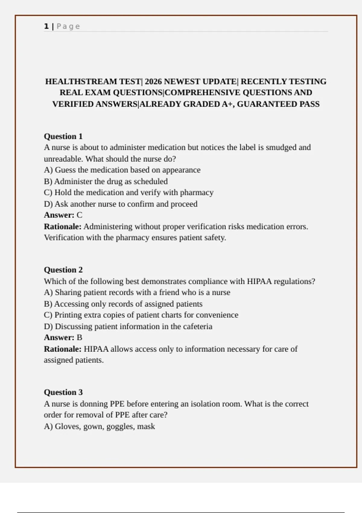 Prepare for success with the updated HealthStream Test 2026 study guide. Access 100% verified exam questions and accurate answers with detailed rationales. Recently tested, comprehensive, and graded A+ to help you pass on the first attempt.