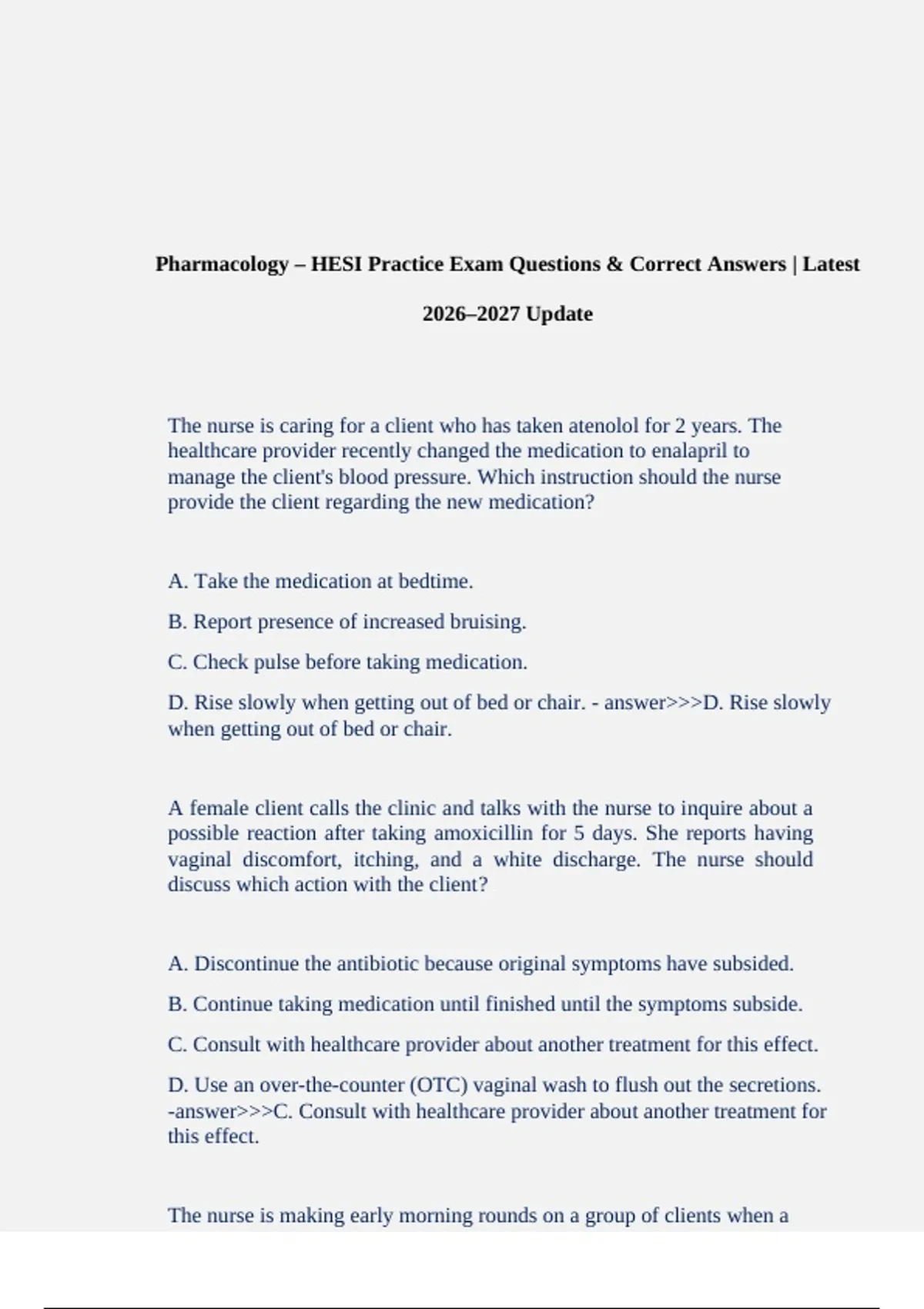 Prepare effectively with the Pharmacology HESI Practice Exam 2025–2026. This updated study resource includes realistic practice questions with verified correct answers and detailed explanations, giving nursing students the edge they need to succeed. Covering major drug classifications, mechanisms of action, side effects, interactions, and nursing considerations, this test bank mirrors the style and content of the actual HESI Pharmacology exam. All questions are carefully reviewed for accuracy and graded A+, ensuring reliability and quality. Ideal for last-minute review or structured exam prep, this resource helps build confidence, strengthen critical thinking, and guarantee readiness for HESI success.