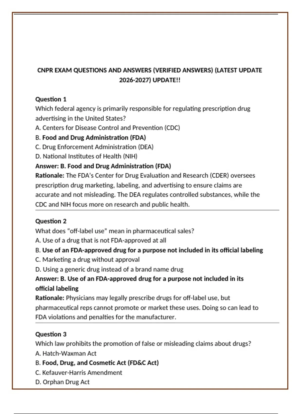 Prepare with confidence for the CNPR Certification Exam 2026–2027 using this complete collection of verified questions and answers. Updated with the latest exam content, this study pack covers pharmaceutical sales knowledge, FDA regulations, pharmacology, healthcare compliance, and drug development essentials. Designed for professionals seeking NAPSRx CNPR certification, it guarantees 100% correct, graded A+ material to help you pass on the first attempt. Perfect for students and sales representatives looking to advance in pharmaceutical sales careers, this CNPR Exam Q&A bank provides detailed explanations, practice scenarios, and exam-ready preparation tools.