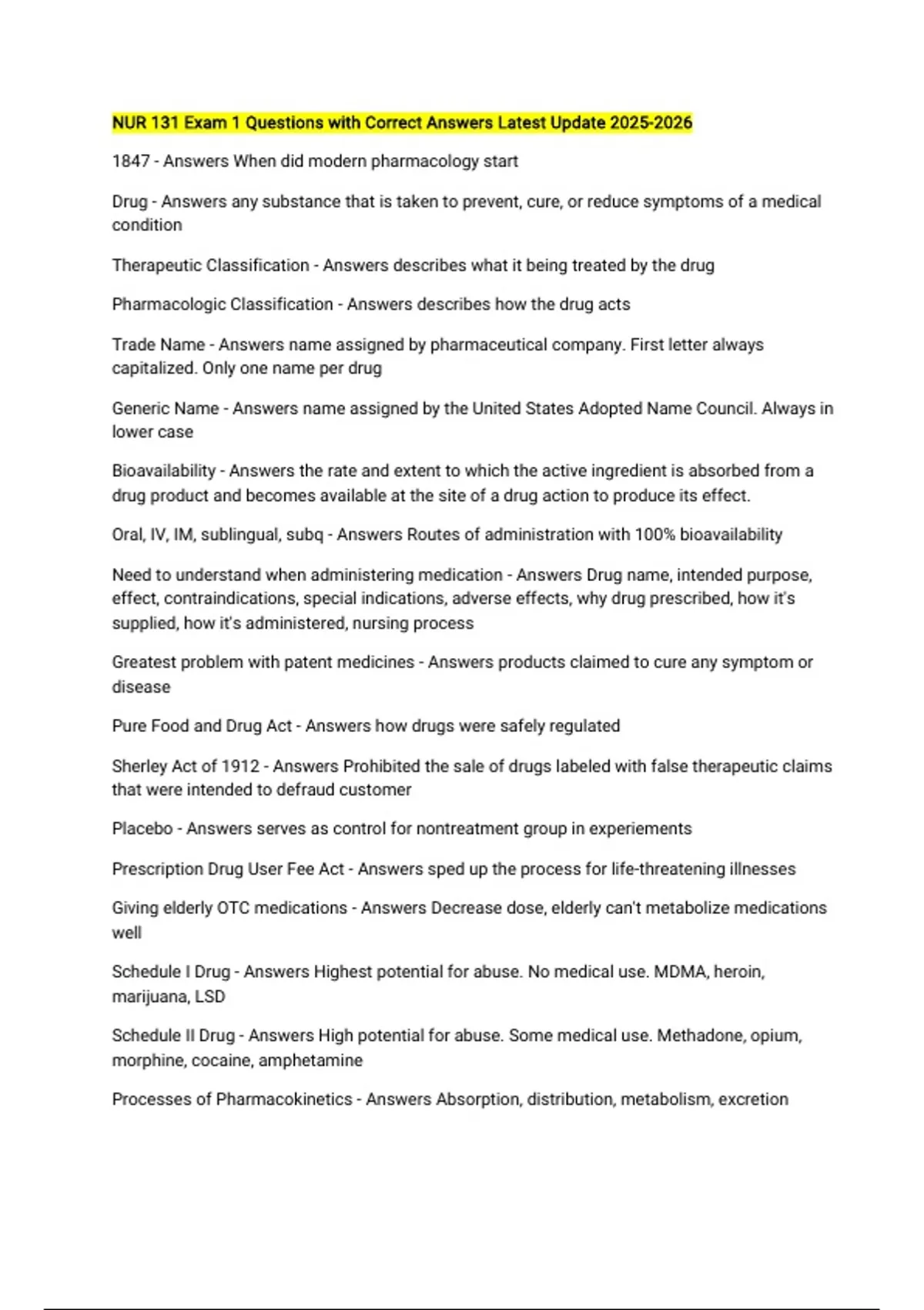 NUR 131 Exam 1 Questions with Correct Answers Latest Update 1847 - Answers When did modern pharmacology start Drug - Answers any substance that is taken to prevent, cure, or reduce symptoms of a medical condition Therapeutic Classification - Answers describes what it being treated by the drug Pharmacologic Classification - Answers describes how the drug acts Trade Name - Answers name assigned by pharmaceutical company. First letter always capitalized. Only one name per drug Generic Name - Answers name assigned by the United States Adopted Name Council. Always in lower case Bioavailability - Answers the rate and extent to which the active ingredient is absorbed from a drug product and becomes available at the site of a drug action to produce its effect. Oral, IV, IM, sublingual, subq - Answers Routes of administration with 100% bioavailability Need to understand when administering medication - Answers Drug name, intended purpose, effect, contraindications, special indications, adverse effects, why drug prescribed, how it's supplied, how it's administered, nursing process Greatest problem with patent medicines - Answers products claimed to cure any symptom or disease Pure Food and Drug Act - Answers how drugs were safely regulated Sherley Act of 1912 - Answers Prohibited the sale of drugs labeled with false therapeutic claims that were intended to defraud customer Placebo - Answers serves as control for nontreatment group in experiements Prescription Drug User Fee Act - Answers sped up the process for life-threatening illnesses Giving elderly OTC medications - Answers Decrease dose, elderly can't metabolize medications well Schedule I Drug - Answers Highest potential for abuse. No medical use. MDMA, heroin, marijuana, LSD Schedule II Drug - Answers High potential for abuse. Some medical use. Methadone, opium, morphine, cocaine, amphetamine Processes of Pharmacokinetics - Answers Absorption, distribution, metabolism, excretion