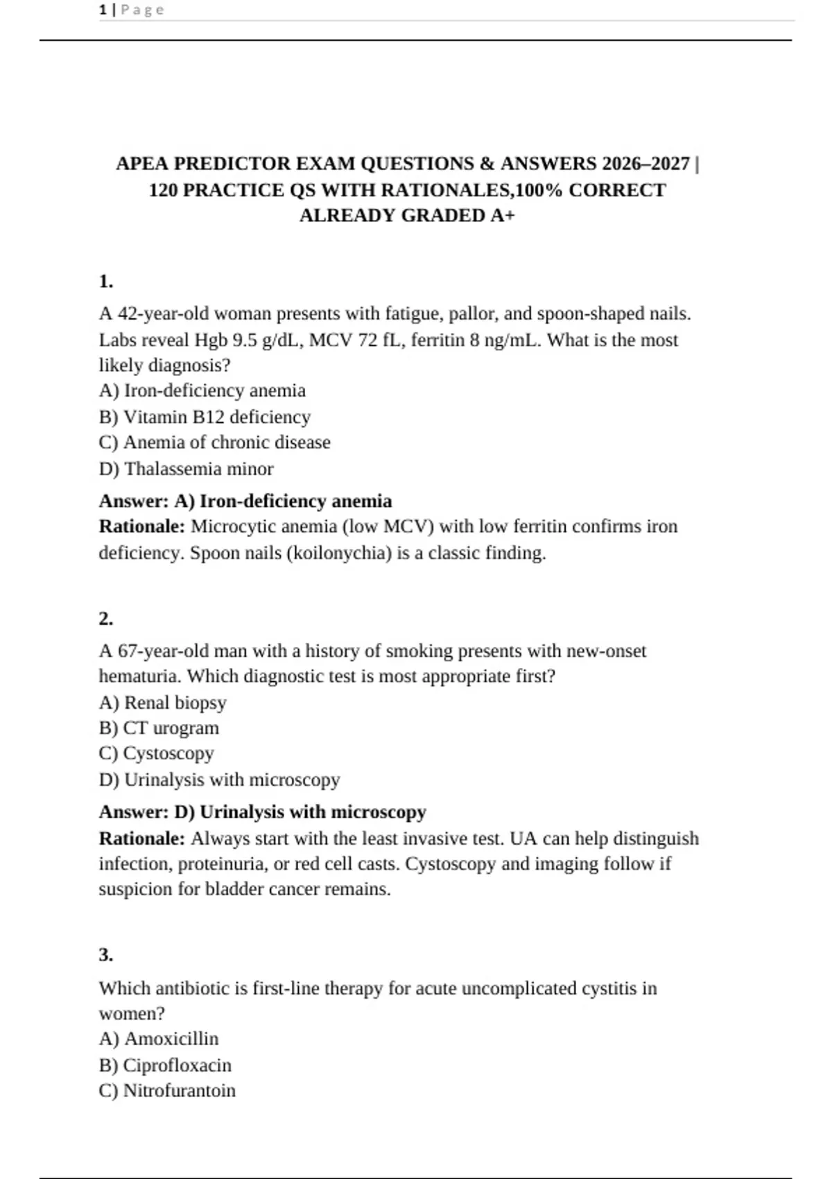 Ace your APEA Predictor Exam with our free 2026–2027 study guide, featuring 120 detailed practice questions and answers with rationales. Covering cardiology, pharmacology, pediatrics, women’s health, primary care, and advanced practice nursing topics, this resource is designed to mirror the APEA Predictor Test format. Each question includes step-by-step explanations to boost clinical reasoning and exam confidence. Perfect for NP students preparing for boards or predictor assessments. Study smarter with organized Q&A, high-yield review points, and evidence-based content. Pass your APEA Predictor Exam on the first attempt with this comprehensive prep tool.
