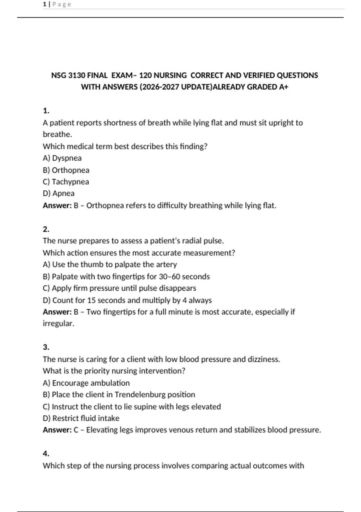 Get ready for your NSG 3130 Exam 1 with this fully updated review featuring 120 nursing practice questions and correct answers. Designed for nursing students preparing for exams, this guide covers essential topics such as the nursing process, safety, pharmacology, fluid and electrolyte balance, infection control, communication, ethics, and patient care fundamentals. Each question includes the correct answer and rationale to support learning, improve confidence, and strengthen exam performance. Updated for 2025, this comprehensive exam prep resource is verified for accuracy and provides a reliable study companion for mastering NSG 3130 concepts and achieving academic success.