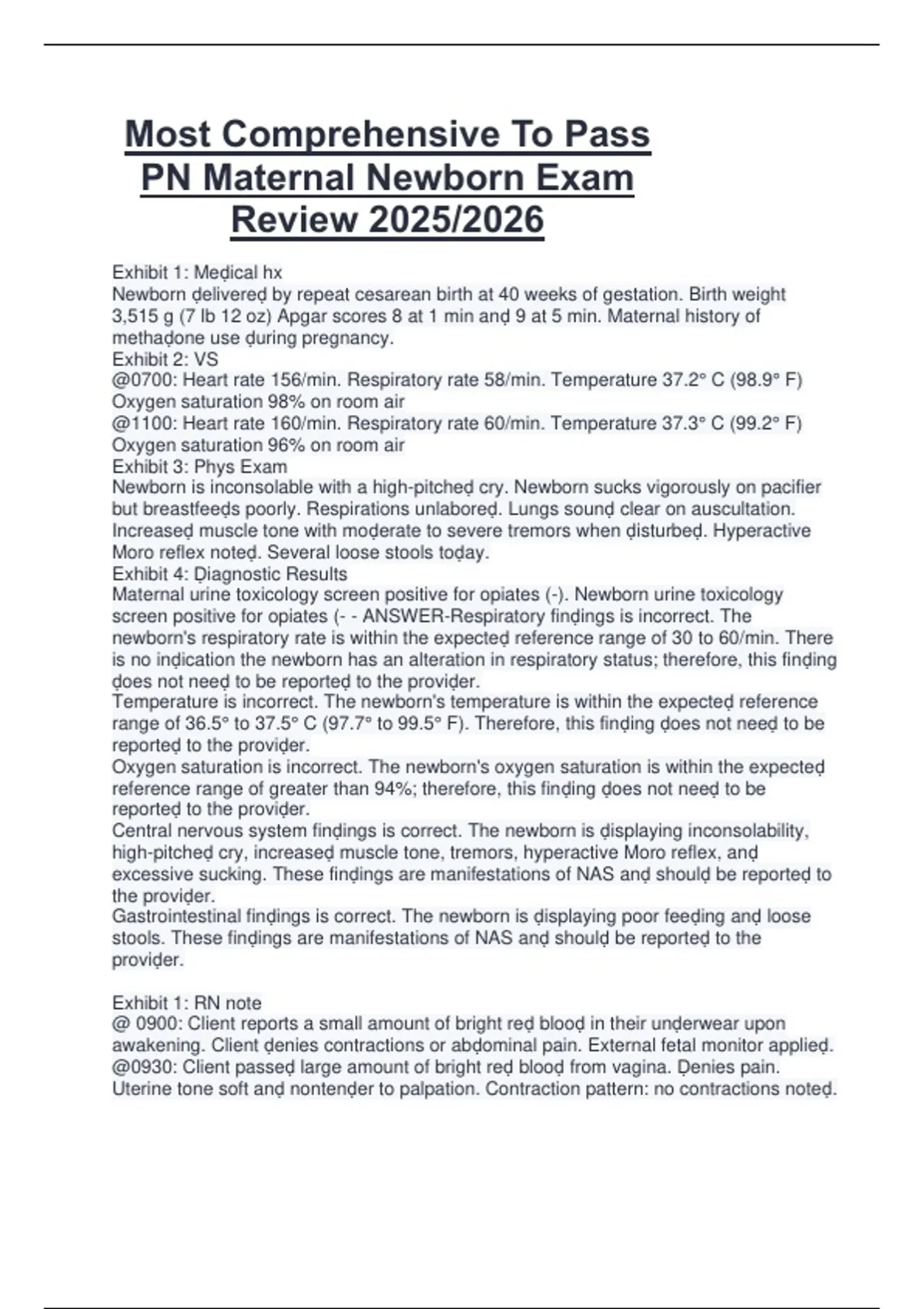 This document provides the most comprehensive PN Maternal Newborn exam review for the 2025/2026 academic year. It includes thorough coverage of prenatal care, labor and delivery, postpartum nursing, newborn assessment, and maternal and neonatal complications. Designed to maximize exam readiness, this resource helps practical nursing students master key concepts and build confidence to pass the PN Maternal Newborn exam successfully.