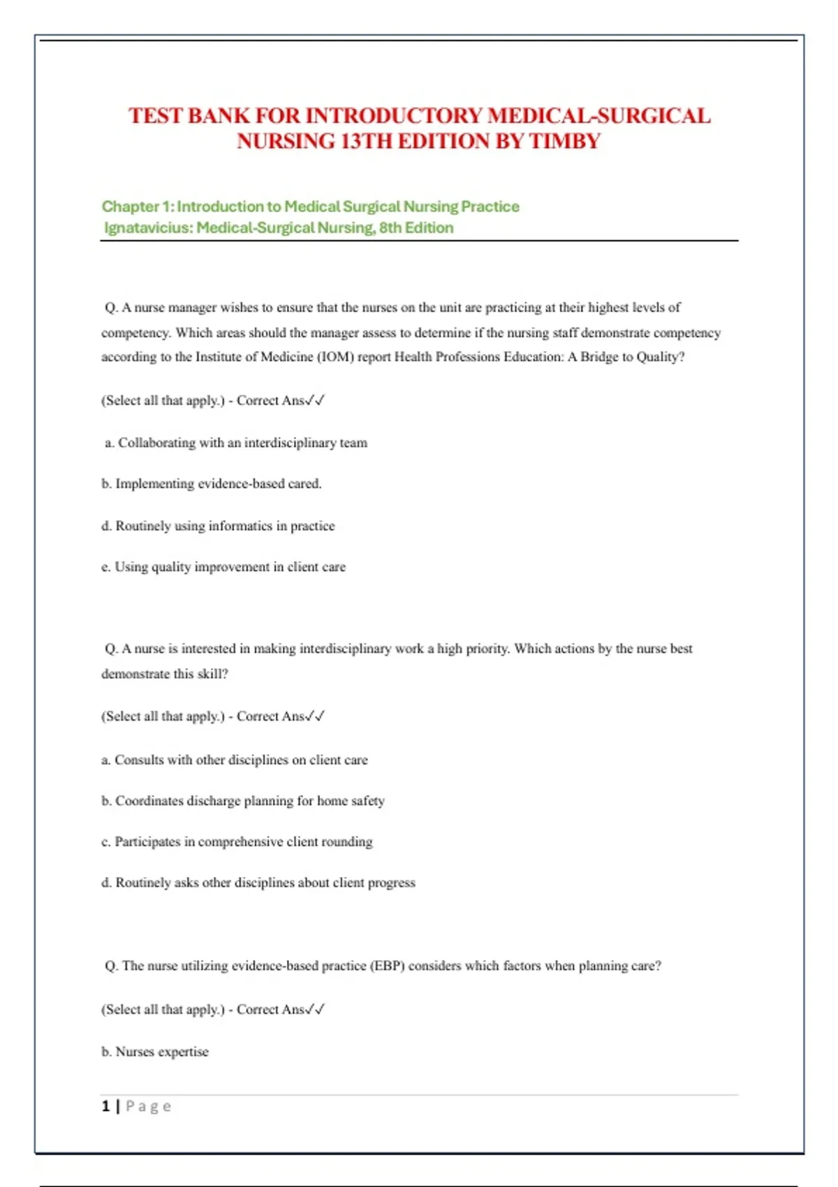 Chapter 1: Introduction to Medical Surgical Nursing Practice