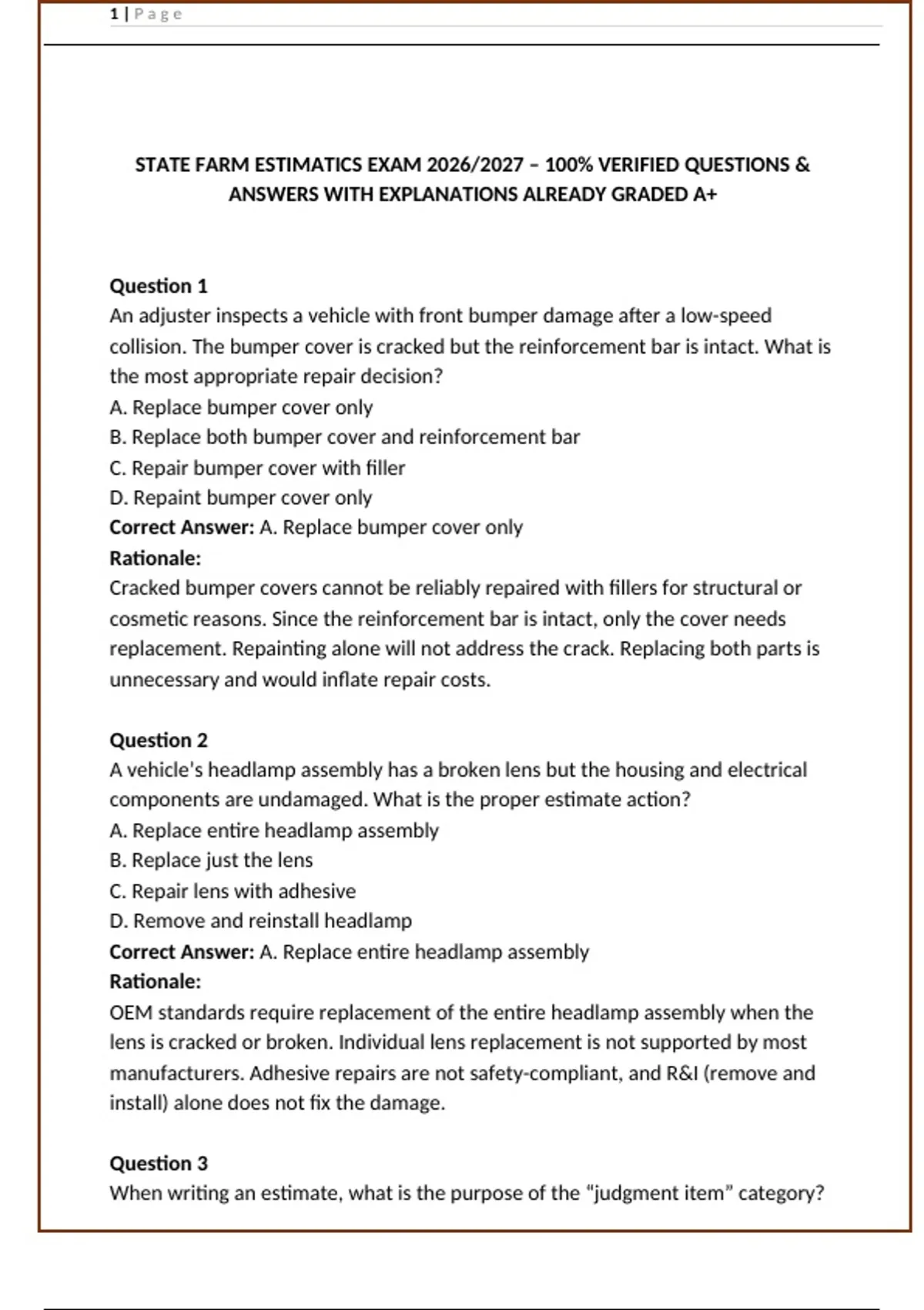 STATE FARM ESTIMATICS EXAM 2026/2027 – 100% VERIFIED QUESTIONS &