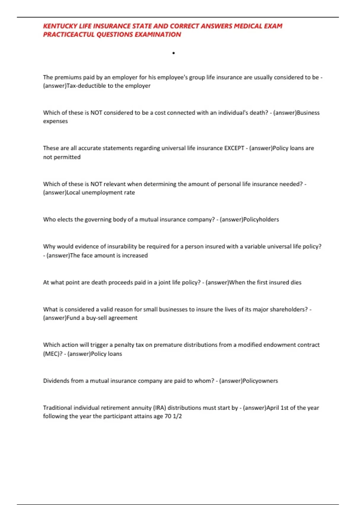 , KENTUCKY LIFE INSURANCE STATE AND CORRECT ANSWERS MEDICAL EXAM