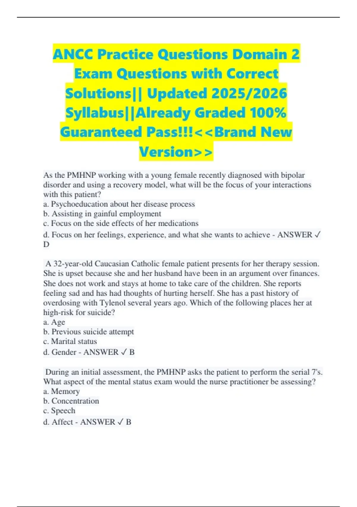 ANCC Practice Questions Domain 2 Exam Questions with Correct Solutions|| Updated 2025/2026 Syllabus||Already Graded 100% Guaranteed Pass!!!&lt;&lt;Brand New Version&gt;&gt; As the PMHNP working with a young female recently diagnosed with bipolar disorder and using a recovery model, what will be the focus of your interactions with this patient? a. Psychoeducation about her disease process b. Assisting in gainful employment c. Focus on the side effects of her medications d. Focus on her feelings, experience, and what she wants to achieve - ANSWER D A 32-year-old Caucasian Catholic female patient presents for her therapy session. She is upset because she and her husband have been in an argument over finances. She does not work and stays at home to take care of the children. She reports feeling sad and has had thoughts of hurting herself. She has a past history of overdosing with Tylenol several years ago. Which of the following places her at high-risk for suicide? a. Age b. Previous suicide attempt c. Marital status d. Gender - ANSWER B During an initial assessment, the PMHNP asks the patient to perform the serial 7's. What aspect of the mental status exam would the nurse practitioner be assessing? a. Memory b. Concentration c. Speech d. Affect - ANSWER B Which of the following illustrates the role of the PMHNP in reducing the stigma of mental illness through community education as primary prevention? a. Professional speaker interviewed by morning television talk show anchor on depression. b. Expert witness for standard of care regarding psychiatric nursing staff in wrongful death lawsuit c. Teaching high school class about depression and teen suicide d. Volunteering to help with depression screenings at a community health fair - ANSWER A In a psychiatric emergency, the PMHNP is aware that the most important goal of the interview is self-protection. What can the PMHNP do to keep himself or herself safe? a. Make sure the patient is restrained before beginning the evaluation b. Enter the room alone, in order to build a therapeutic alliance c. Know as much about the person as possible prior to starting the interview d. Inform the patient that violence is not acceptable. - ANSWER C When questioning a patient regarding alcohol use during an intake, the patient t3ells you he only drinks socially. Which initial response is most appropriate? a. What amount and what kind of alcohol do you drink in a week? b. I am glad you are a responsible drinker. c. Many people with alcohol issues say they are social drinkers. d. Do other people in your household drink alcohol? - ANSWER A During a follow-up medication visit with a 13-year-old male, his mother stayed longer to ask the PMHNP a question. Specifically, his mother states, "The school sent home information about the human papillomavirus and suggested my son see his primary care provider to get an immunization. Why did I get this information for my son? Furthermore, he is not sexually active." Which of the following would be the PMHNP's best response? a. I understand your concern with talking to your son about becoming sexually active. Let's address how to start the conversation. b. You are correct, only females need to receive the human papillomavirus vaccination. This letter must have been sent to you by mistake. c. Decisions about immunizations can be difficult. The Centers for Disease Control and Prevention recommend that all males between the ages of 11-12, or as early as 9 years of age, receive this vaccination. What concerns do you ha - ANSWER C The World Health Organization has predicted that depression will be the number one world health problem in the 21st century. Lifetime prevalence for major depressive episode is 12% (with a 5-17% range). Which of the following individuals has the greatest risk factors for MDD? a. 16-year-old, high school male, honors student, who runs cross-country track b. 28-year-old, single woman, working toward partner in a large law firm c. 43-year-old, divorced woman, schoolteacher, raising three children d. 58-year-old, married male, computer analyst, whose work requires frequent travel - ANSWER C