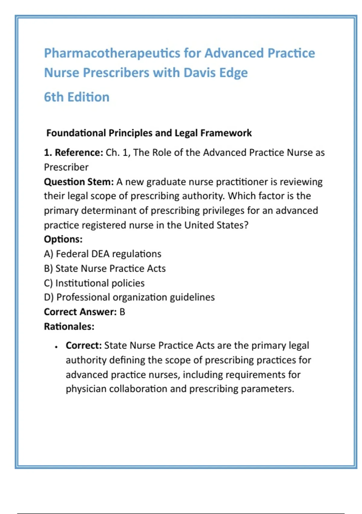 Pharmacotherapeutics for Advanced Practice Nurse Prescribers 6th Edition Test Bank | 1,000+ MCQs with Verified Answers & Rationales 2. Description Ace your advanced pharmacology coursework and build unshakable confidence for your certification exams with the ultimate test bank for Pharmacotherapeutics for Advanced Practice Nurse Prescribers, 6th Edition by Teri Moser Woo and Wendy L. Wright. This comprehensive resource is meticulously aligned with the textbook and AACN/NONPF criteria, providing the targeted practice you need to master the role of a prescriber . Our test bank offers full coverage of all 52 chapters, providing a complete review of foundational pharmacologic principles, pharmacotherapeutics with single and multiple drugs, and special treatment considerations for diverse patient populations . For each chapter, you get 20 original, evidence-based multiple-choice questions designed to reinforce conceptual understanding and clinical application. With over 1,000 questions total, you can simulate the full scope of your exams . We go beyond simple answers. Each question includes verified, step-by-step rationales that explain the correct option and clarify why the distractors are incorrect. This deep, conceptual review transforms memorization into true understanding, ensuring you grasp the "why" behind rational drug selection, patient safety, and therapeutic monitoring . This test bank is your strategic partner for success. It is designed not just to help you pass your course exams, but to build the critical clinical reasoning skills required for safe prescribing and for passing your board and certification exams. Invest in your future as a safe, effective, and advanced practice nurse prescriber. 3. Keywords Pharmacotherapeutics for Advanced Practice Nurse Prescribers 6th Edition Woo Wright Test Bank Advanced Practice Nurse Prescriber Exam Prep NP Prescribing Test Bank Nursing Pharmacology MCQs NCLEX Review Advanced Pharmacology Davis Edge Questions Nurse Practitioner Study Guide Rational Drug Selection Questions Nursing Test Bank with Rationales 4. Hashtags #NursePractitioner #NPStudent #APRN #NCLEXPrep #NursingExams #Pharmacology #NursingSchool #TestBank #NurseLife #StudyGuide