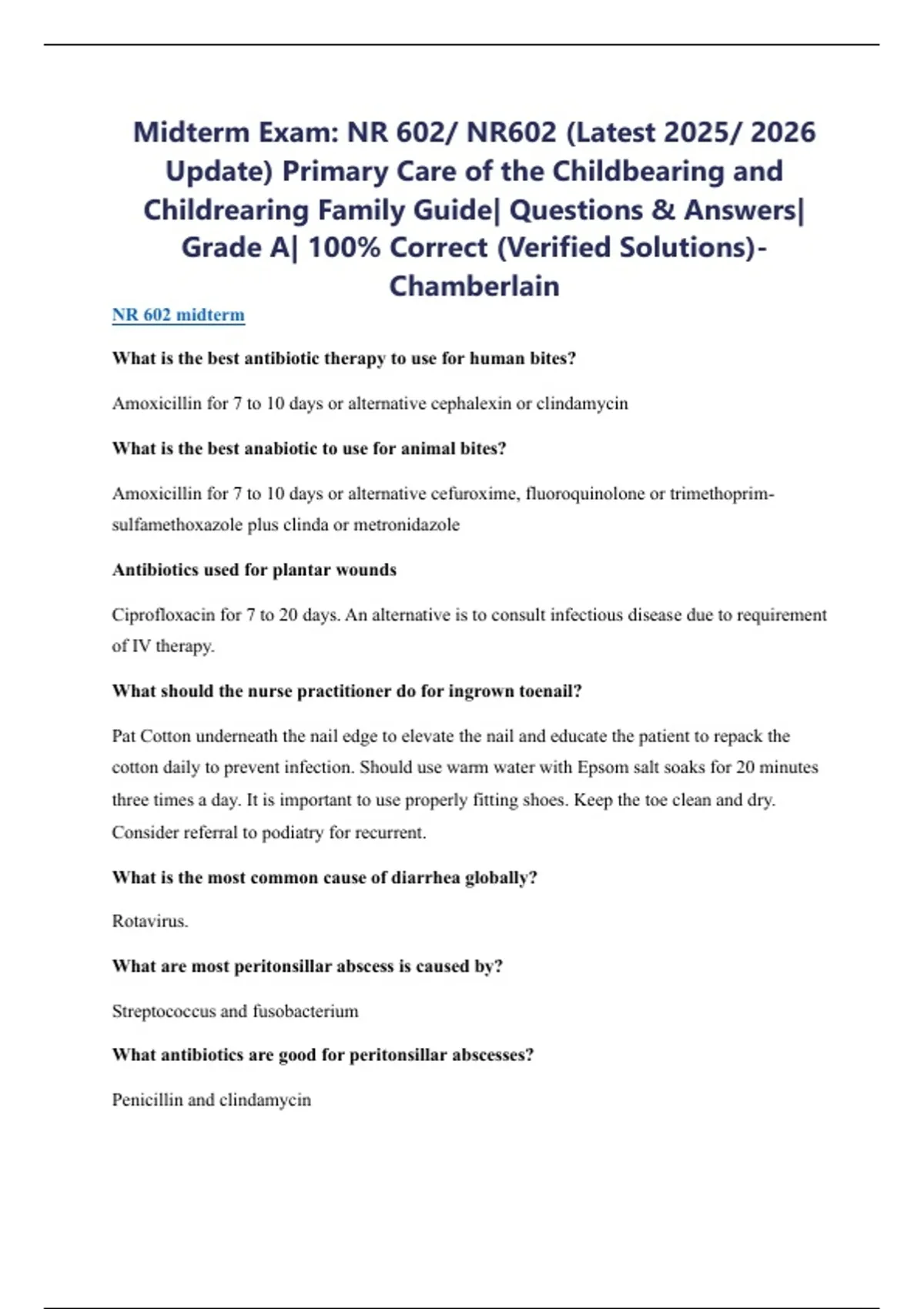 Midterm Exam: NR 602/ NR602 (Latest 2025/ 2026 Update) Primary Care of the Childbearing and Childrearing Family Guide| Questions & Answers| Grade A| 100% Correct (Verified Solutions)- Chamberlain