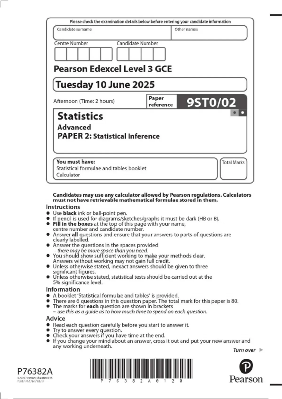 2025 Pearson Edexcel Level 3 GCE 9ST0/02 Statistics Advanced PAPER 2: Statistical Inference