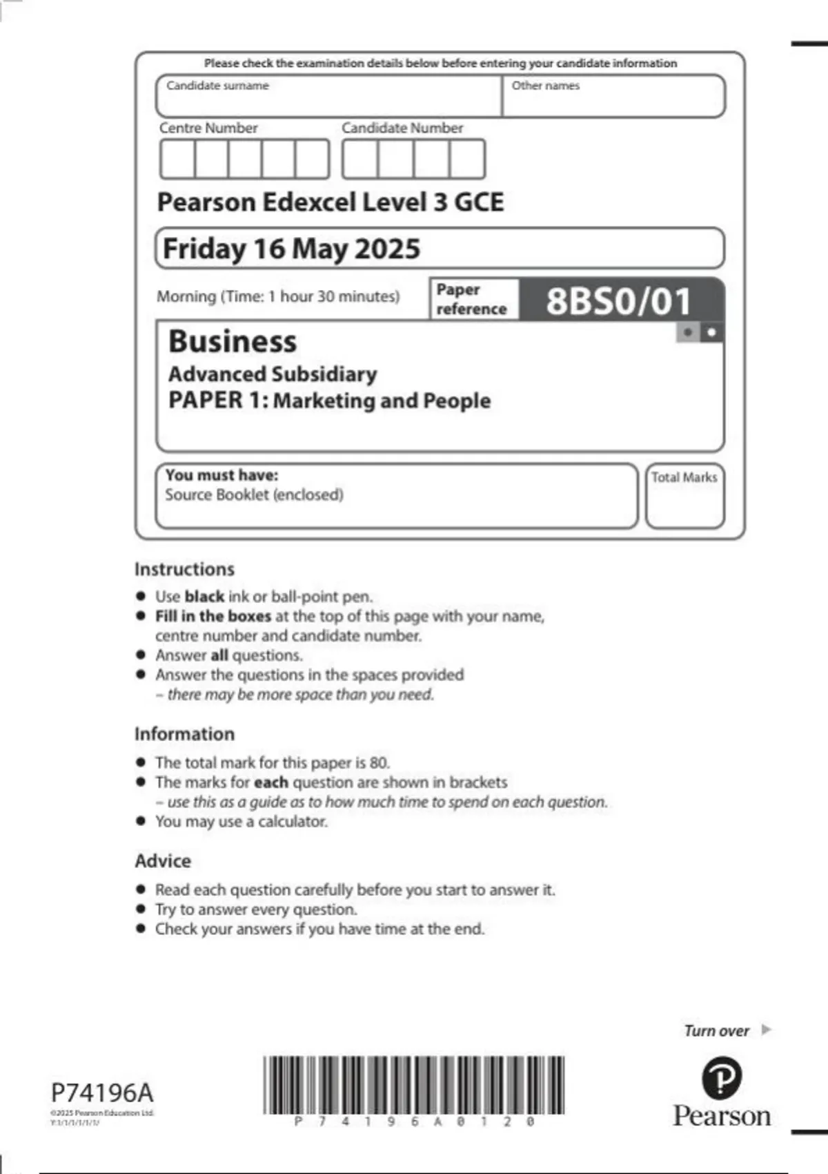 PEARSON EDEXCEL ADVANCED SUBSIDIARY LEVEL BUSINESS PAPER 1 JUNE 2025 FINAL QUESTION PAPER