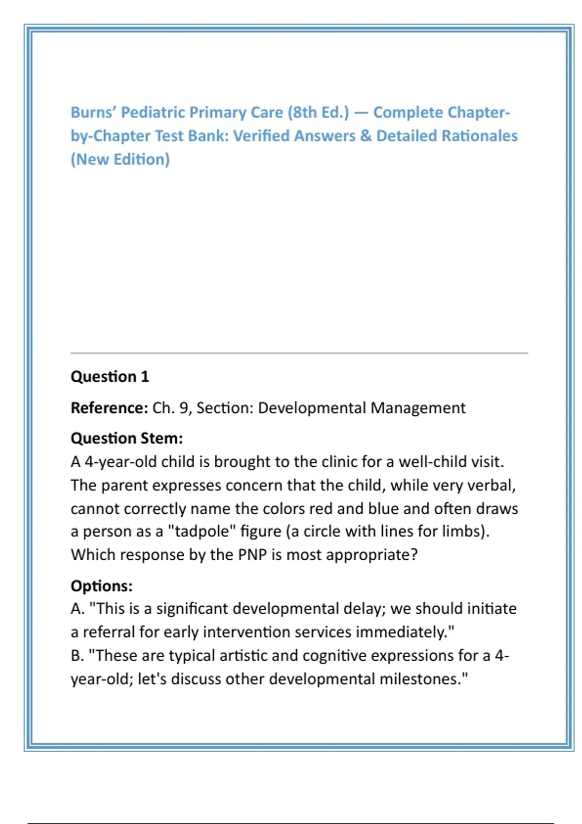 Burns' Pediatric Primary Care 8th Edition Test Bank | Q&A Burns' Pediatric Primary Care 8th Edition Test Bank: NCLEX & HESI Prep SEO-Friendly Description Master pediatric primary care and ace your certification exams with the definitive test bank for Burns' Pediatric Primary Care, 8th Edition. This essential resource is meticulously crafted to align with the textbook by Dawn Lee Garzon, Mary Dirks, Martha Driessnack, Karen G. Duderstadt, and Nan M. Gaylord, providing comprehensive coverage of assessment, diagnosis, management, prescribing, and health promotion. Our test bank features 20 high-yield multiple-choice questions per chapter, each designed to mirror the rigor and clinical reasoning required for the NCLEX-RN, HESI, and pediatric nurse practitioner board exams. You don't just get the correct answers; you get step-by-step rationales that break down the evidence-based thinking behind each option, transforming memorization into true understanding. This is the ultimate tool for nursing students to build confidence, for instructors to create validated assessments, and for aspiring PNPs to ensure certification success. Invest in your future and elevate your pediatric nursing expertise. Get the competitive edge you need to excel in the classroom, clinicals, and on test day. High-Impact Keywords Burns Pediatric Primary Care Test Bank Pediatric Primary Care 8th Edition NCLEX Pediatric Questions HESI Exam Prep PNP Board Review Nursing Test Bank Pediatric Nurse Practitioner Dawn Lee Garzon Pediatric Primary Care Q&A Nursing Certification Prep SEO-Driven Hashtags #BurnsPediatric #PediatricPrimaryCare #TestBank #NCLEXPrep #HESIExam #PNPBoard #NursingStudent #NursingEducation #PediatricNP #Burns8thEdition