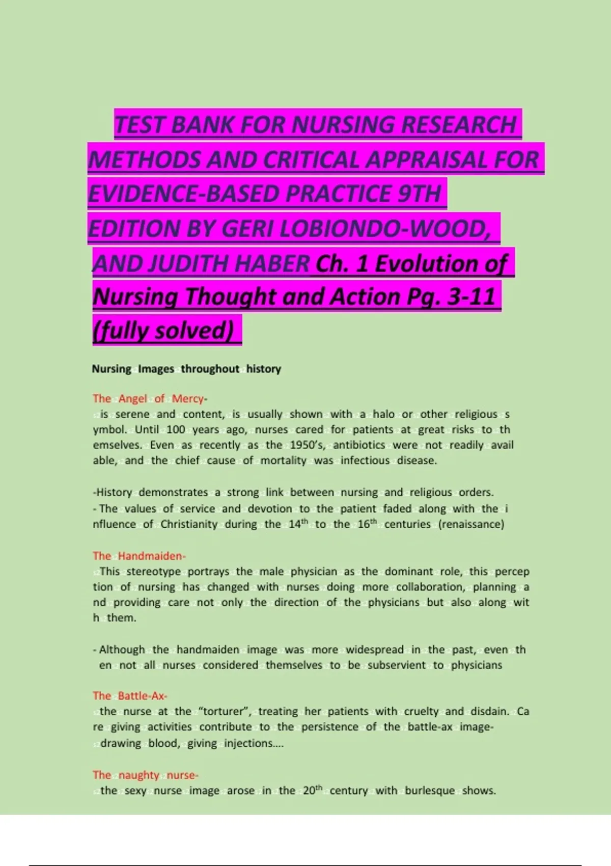 TEST BANK FOR NURSING RESEARCH METHODS AND CRITICAL APPRAISAL FOR EVIDENCE-BASED PRACTICE 9TH EDITION BY GERI LOBIONDO-WOOD, AND JUDITH HABER Ch. 1 Evolution of Nursing Thought and Action Pg. 3-11 (fully solved) TEST BANK FOR NURSING RESEARCH METHODS AND CRITICAL APPRAISAL FOR EVIDENCE-BASED PRACTICE 9TH EDITION BY GERI LOBIONDO-WOOD, AND JUDITH HABER Ch. 1 Evolution of Nursing Thought and Action Pg. 3-11 (fully solved)