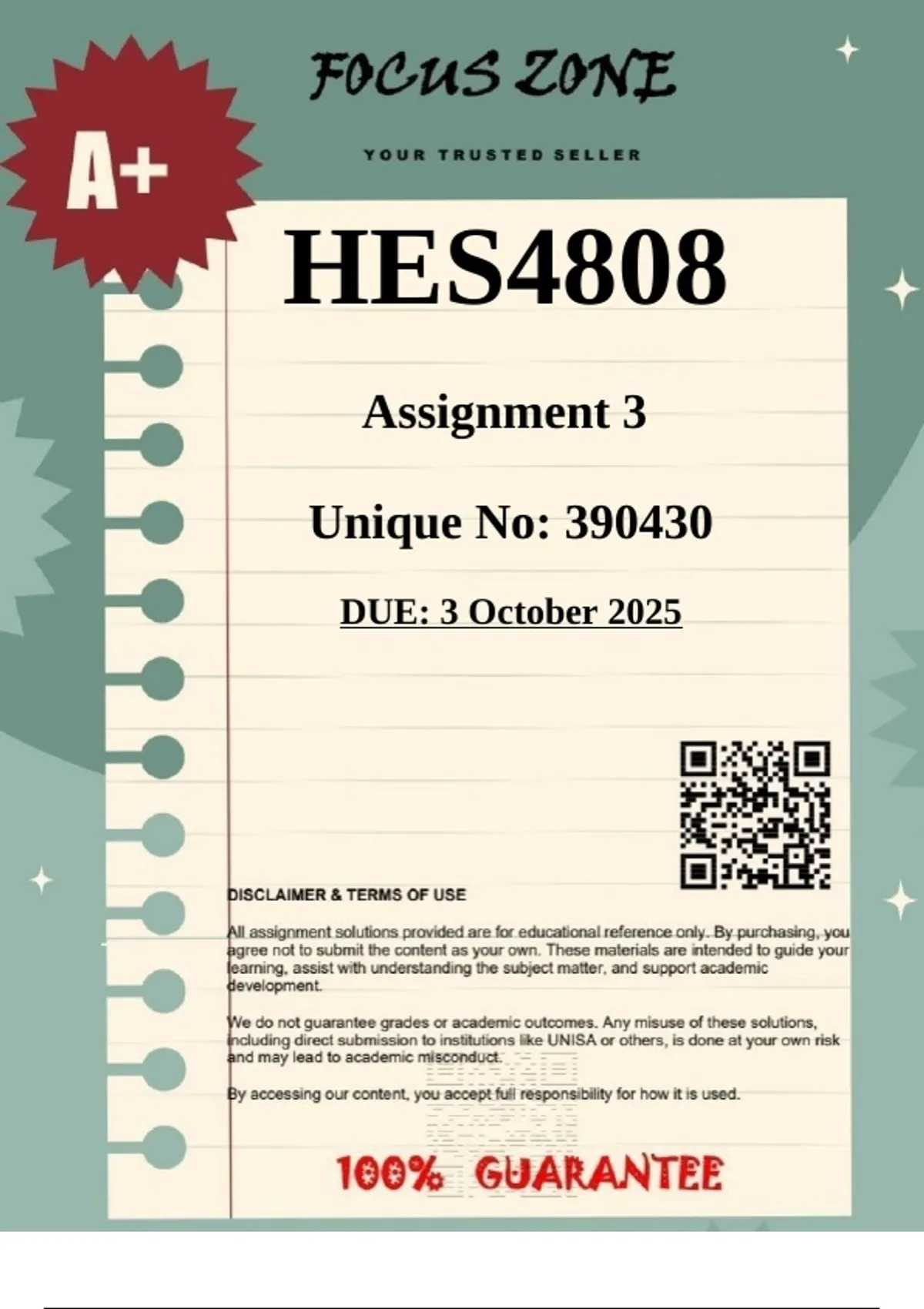 HES4808 Assignment 3 (390430)|CLEAR COMPLETE ANSWERS|- DUE 3 October 2025. EXPERTLY DETAILED ANSWERS.