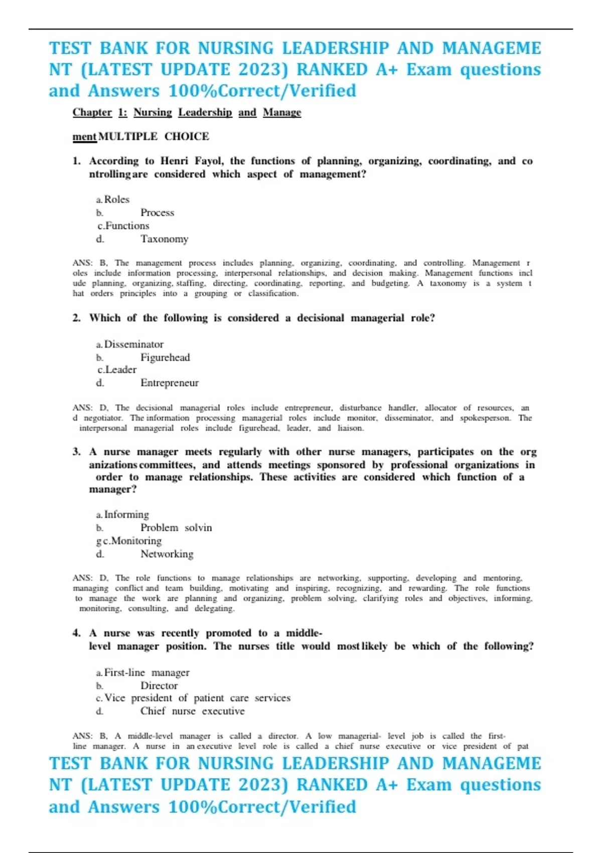 TEST BANK FOR NURSING LEADERSHIP AND MANAGEME