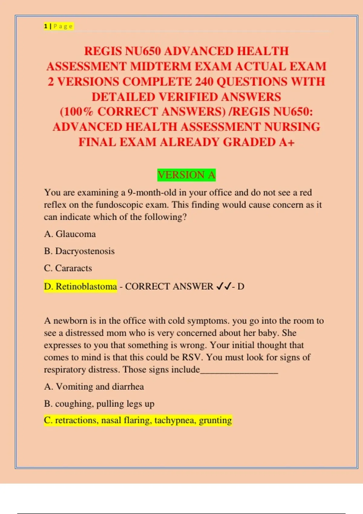 REGIS NU650 ADVANCED HEALTH ASSESSMENT MIDTERM EXAM ACTUAL EXAM 2 VERSIONS COMPLETE 240 QUESTIONS WITH DETAILED VERIFIED ANSWERS (100% CORRECT ANSWERS) /REGIS NU650: ADVANCED HEALTH ASSESSMENT NURSING FINAL EXAM ALREADY GRADED A+