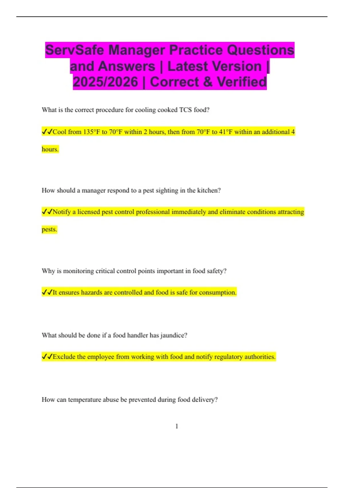 ServSafe Manager Practice Questions and Answers | Latest Version | 2025/2026 | Correct & Verified What is the correct procedure for cooling cooked TCS food? Cool from 135°F to 70°F within 2 hours, then from 70°F to 41°F within an additional 4 hours. How should a manager respond to a pest sighting in the kitchen? Notify a licensed pest control professional immediately and eliminate conditions attracting pests. Why is monitoring critical control points important in food safety? It ensures hazards are controlled and food is safe for consumption. What should be done if a food handler has jaundice? Exclude the employee from working with food and notify regulatory authorities. How can temperature abuse be prevented during food delivery? 2 Use insulated containers and monitor temperatures upon receipt. What is the maximum time TCS food can be in the danger zone before it must be discarded? 4 hours total, including preparation and holding time. What is the proper way to store chemicals in a food operation? Separate from food, food-contact surfaces, and utensils, and label them clearly. What is the first step a manager should take when a foodborne illness outbreak is suspected? Notify local regulatory authorities and gather information about the suspected foods and symptoms. How often should a food manager review temperature logs for TCS foods? At least once per day or more frequently depending on the operation. What is the proper internal temperature for cooking poultry? 165°F (74°C) for 15 seconds. 3 How can a manager prevent cross-contamination during food prep? By using separate cutting boards, utensils, and storage containers for raw and ready-to-eat foods. What should be done if a food handler shows symptoms of vomiting or diarrhea? Exclude the employee from working with food until cleared by a medical professional. Why is it important to maintain proper handwashing procedures in a food operation? Proper handwashing prevents the transfer of pathogens to food and surfaces. How should ready-to-eat TCS foods be stored in a refrigerator? Above raw meats, poultry, and seafood to prevent drips and cross-contamination. What is the minimum internal cooking temperature for ground beef? 155°F (68°C) for 15 seconds. How often should sanitizer solution be tested in a restaurant? At the beginning of each shift and whenever the solution is changed. 4 What is the correct action if a chemical contaminant is found in food? Discard the contaminated food and identify the source to prevent further contamination. How should a manager handle a food recall