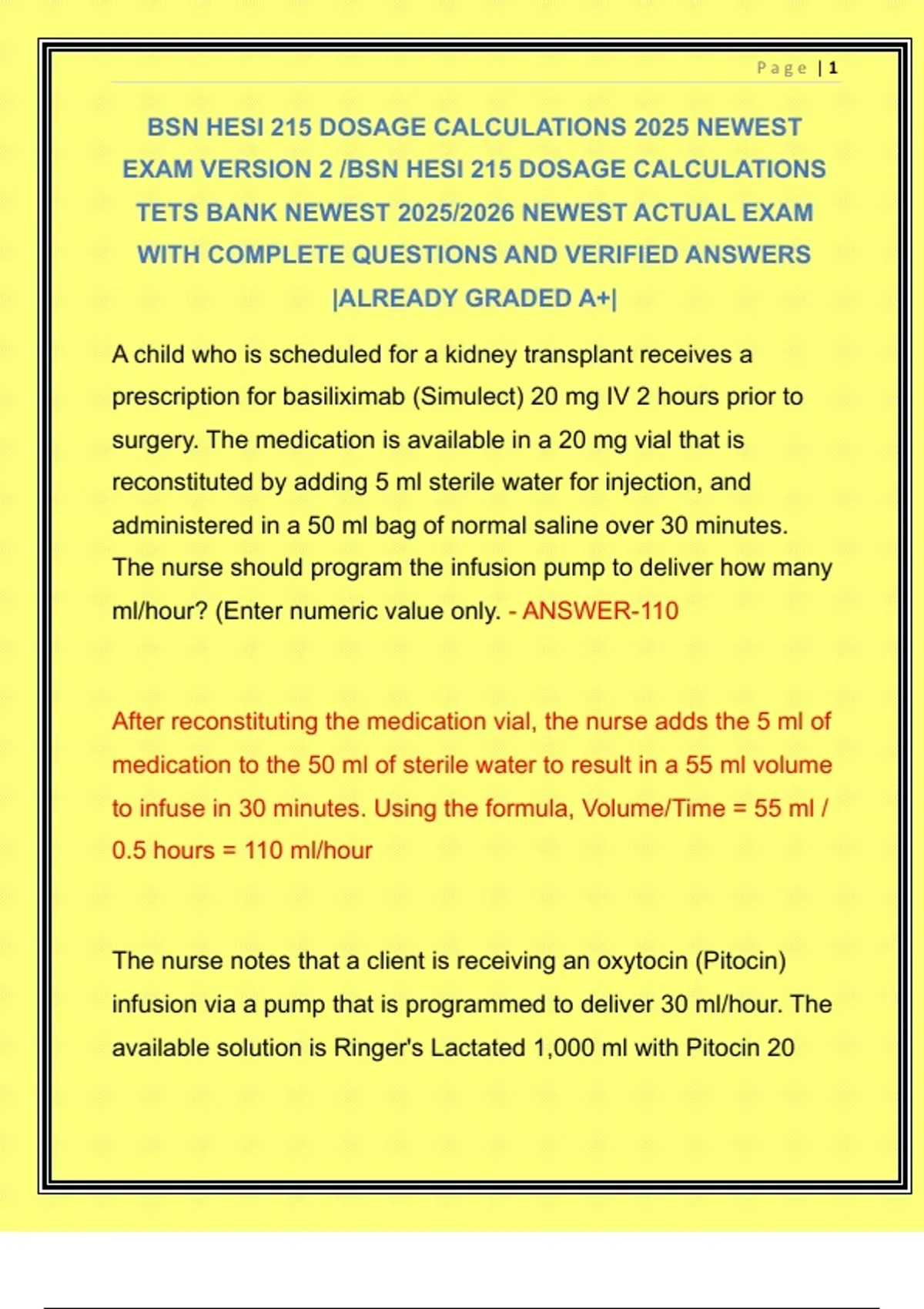 BSN HESI 215 DOSAGE CALCULATIONS 2025 NEWEST EXAM VERSION 2 /BSN HESI 215 DOSAGE CALCULATIONS TETS BANK NEWEST 2025/2026 NEWEST ACTUAL EXAM WITH COMPLETE QUESTIONS AND VERIFIED ANSWERS |ALREADY GRADED A+|