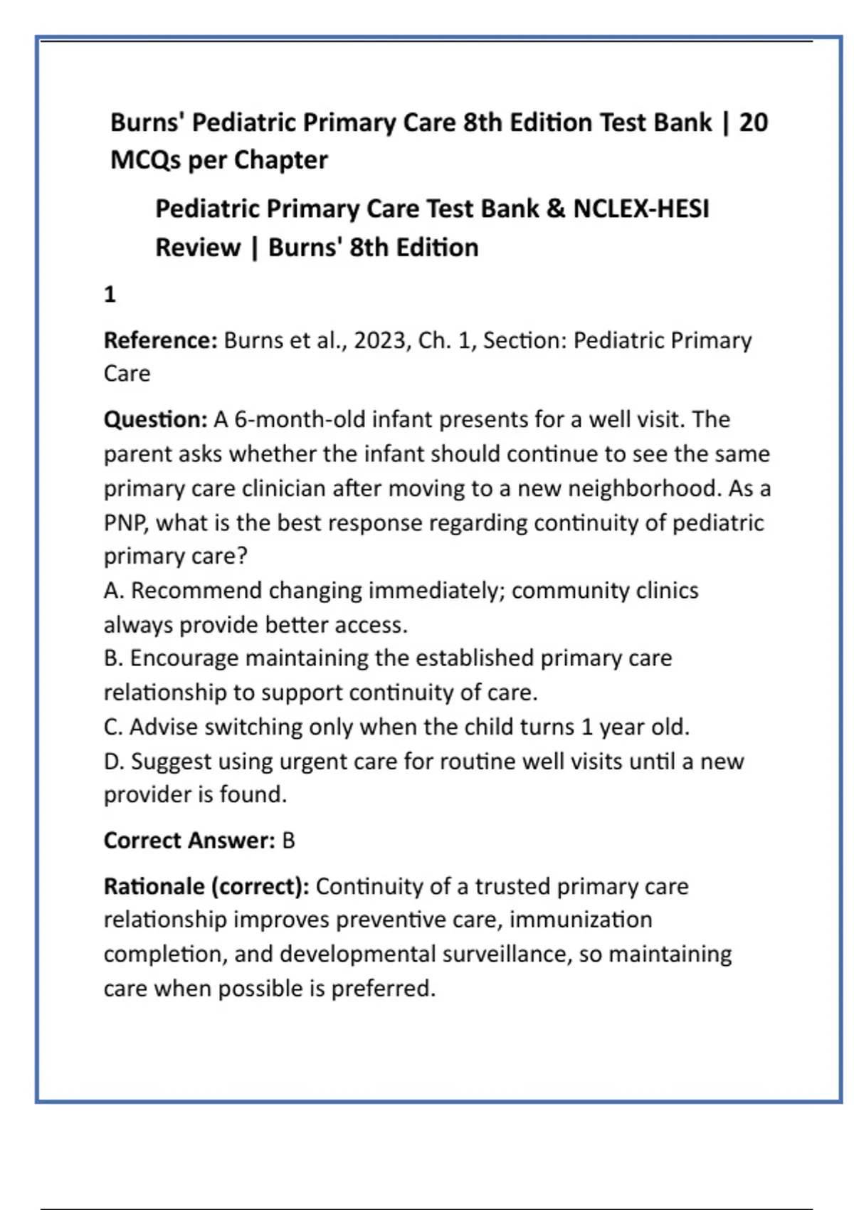 Burns’ Pediatric Primary Care Test Bank | Complete NCLEX & HESI Exam Prep with Answers Prepare with confidence using the Burns’ Pediatric Primary Care Complete Test Bank, an essential study and teaching resource for nursing and advanced practice education. Based on the authoritative textbook by Garzon, Dirks, Driessnack, Duderstadt, and Gaylord, this test bank delivers comprehensive coverage of every chapter with 20 multiple-choice questions (MCQs) per chapter. Each item includes the correct answer with step-by-step verified rationales, ensuring you not only know the right choice but also understand the reasoning behind it. Designed to align with NCLEX-RN®, HESI®, and advanced practice board certification standards, this resource supports mastery of pediatric primary care concepts, clinical decision-making, and exam success. Perfect for students, nurse practitioner candidates, and instructors, this test bank enhances study efficiency, reinforces critical knowledge, and provides reliable practice for high-stakes exams. Whether used for self-study, classroom support, or certification review, this trusted test bank ensures you are fully prepared to succeed. #PediatricPrimaryCare #BurnsTestBank #NursingExamPrep #NCLEXPracticeQuestions #HESIStudyGuide #NursePractitionerReview #MedicalEducation #BoardCertificationPrep #TestBankResource #NursingStudents Burns’ Pediatric Primary Care test bank Pediatric nursing exam questions NCLEX pediatric practice test HESI pediatric care review Pediatric nurse practitioner test bank Nursing exam prep with rationales Pediatric primary care MCQs Board certification pediatric practice Burns pediatric test bank 8th edition Nursing instructor resources NCLEX pediatric question bank Verified nursing test bank