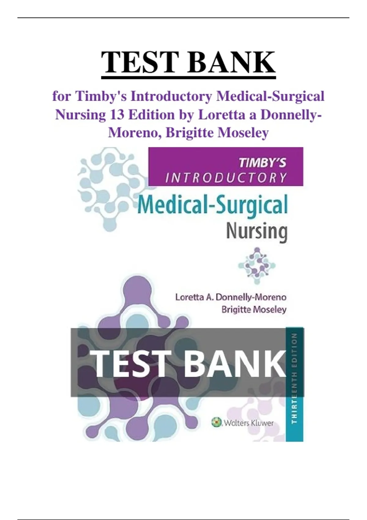 Download Test Bank For Timby's Introductory Medical-Surgical Nursing 13th Edition by Loretta A Donnelly-Moreno Test banks are a valuable resource for students all over the world, especially when you're running out of time and need a quick way to review material. They are also great for improving your academic performance, as they have been proven to enhance your overall understanding of any subject. In addition, they can help you prepare for future courses, bridging the gap between what you study now and what will be required later.