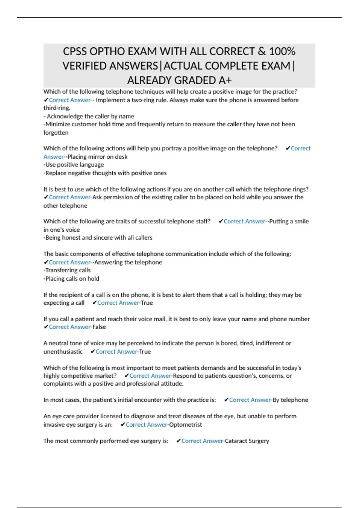 ✔Correct Answer--Answering the telephone