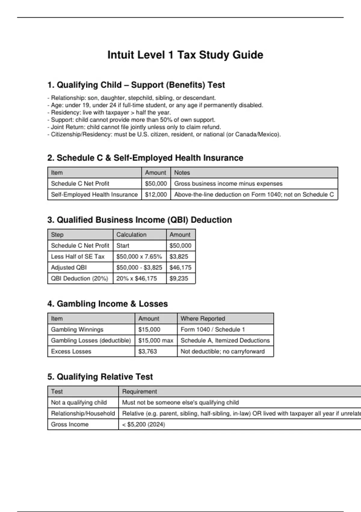 Intuit Level 1 Exam study guide Pass guarantee or Money back Pass the Intuit Level 1 Tax Exam on Your First Try – or Risk Losing Your Chance at a High-Paying Tax Career! Are you stressed about the Intuit Level 1 Tax Exam? You’re not alone—most aspiring tax professionals struggle with overwhelming IRS rules, confusing deductions, and endless forms. One mistake can cost you your score, delay your certification, and hurt your dream job prospects. This guide is your secret weapon: Covers Schedule C, QBI deductions, self-employed health insurance, gambling rules, dependent tests, filing statuses, and 28 key tax facts you must know to pass. Easy-to-Digest Tables & Bullet Points: memorize exactly what the exam will test. Real-Life Examples: Learn how to apply rules to half-siblings, domestic partnerships, gambling, and self-employment scenarios—just like the exam questions. Beat Exam Anxiety: Stop wasting hours searching IRS rules—this guide shows you exactly what matters to pass.