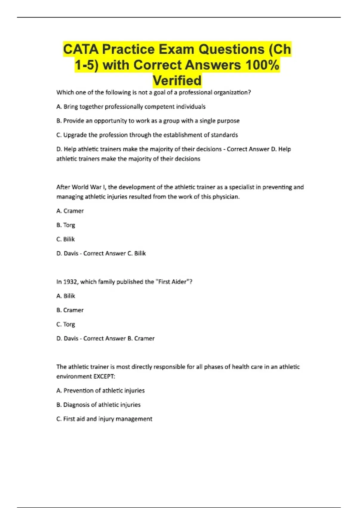 CATA Practice Exam Questions (Ch 1-5) with Correct Answers 100% Verified Which one of the following is not a goal of a professional organization? A. Bring together professionally competent individuals B. Provide an opportunity to work as a group with a single purpose C. Upgrade the profession through the establishment of standards D. Help athletic trainers make the majority of their decisions - Correct Answer D. Help athletic trainers make the majority of their decisions After World War I, the development of the athletic trainer as a specialist in preventing and managing athletic injuries resulted from the work of this physician. A. Cramer B. Torg C. Bilik D. Davis - Correct Answer C. Bilik In 1932, which family published the "First Aider"? A. Bilik B. Cramer C. Torg D. Davis - Correct Answer B. Cramer The athletic trainer is most directly responsible for all phases of health care in an athletic environment EXCEPT: A. Prevention of athletic injuries B. Diagnosis of athletic injuries C. First aid and injury management D. Implemen