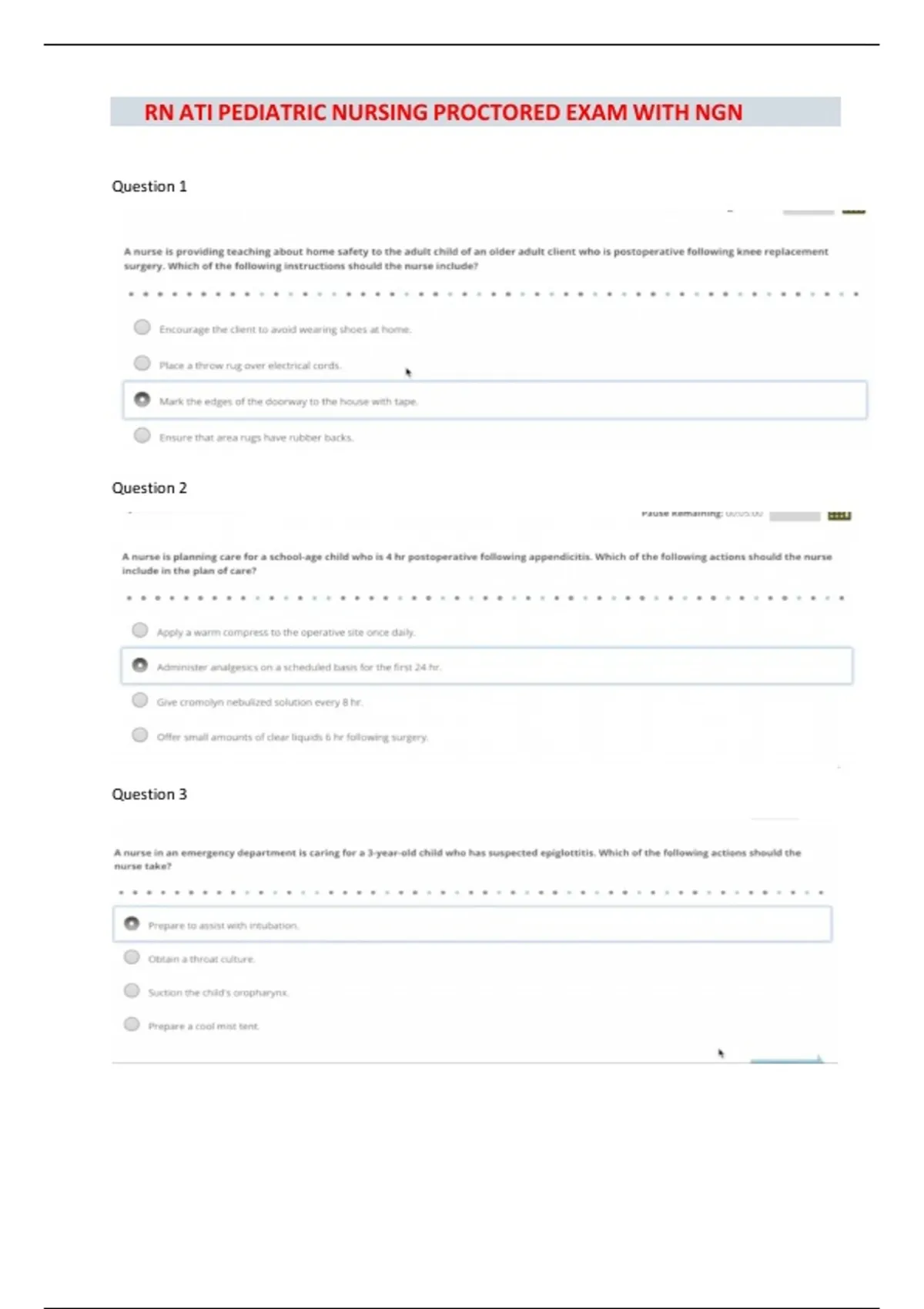 This document provides a complete study resource for the RN ATI Pediatric Nursing Proctored Exam with Next Generation NCLEX (NGN) style questions. It includes updated pediatric nursing exam questions with correct answers and explanations to strengthen clinical judgment and critical thinking. Designed to help nursing students prepare effectively for the ATI Peds NGN proctored exam.