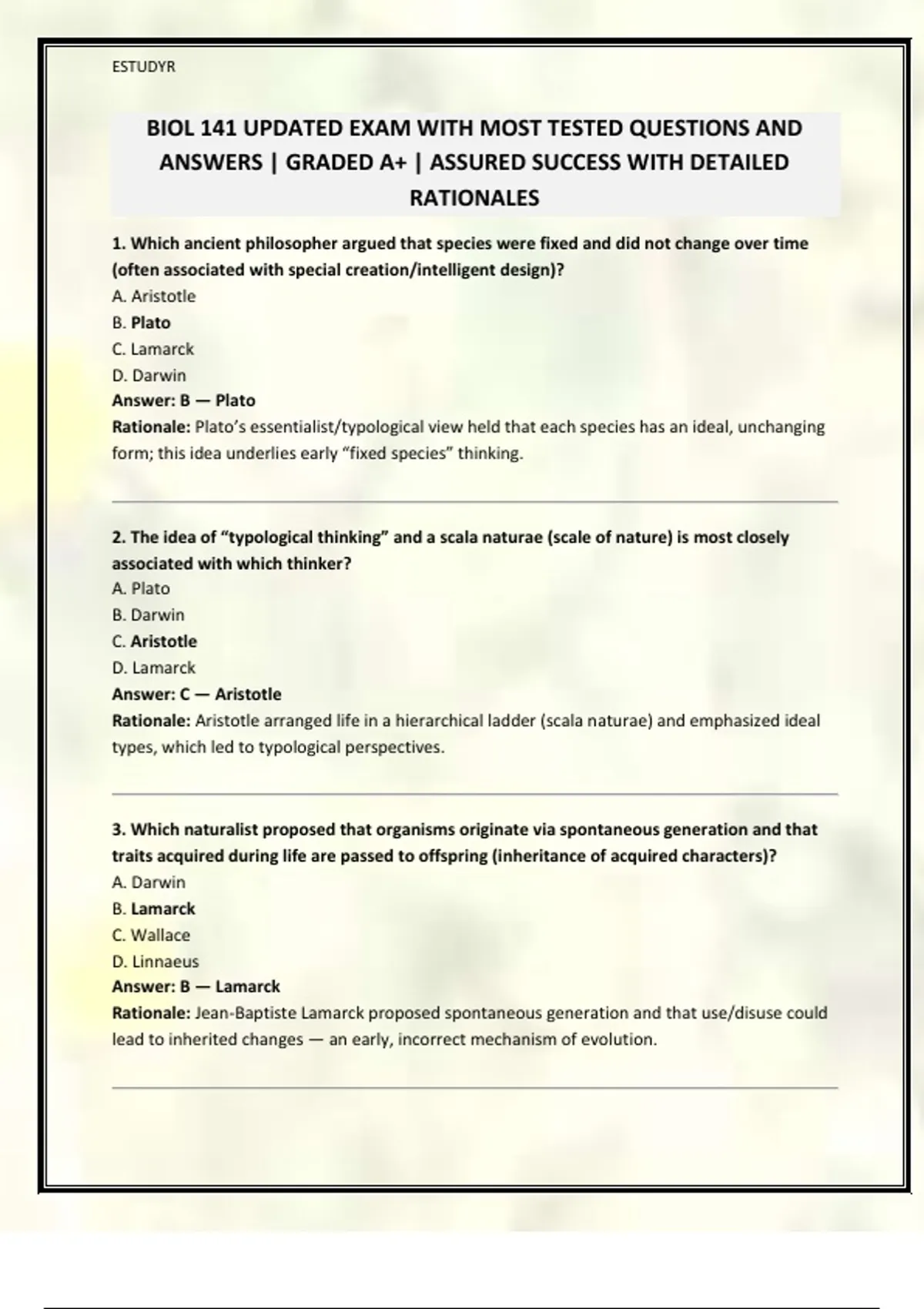 BIOL 141 UPDATED EXAM WITH MOST TESTED QUESTIONS AND